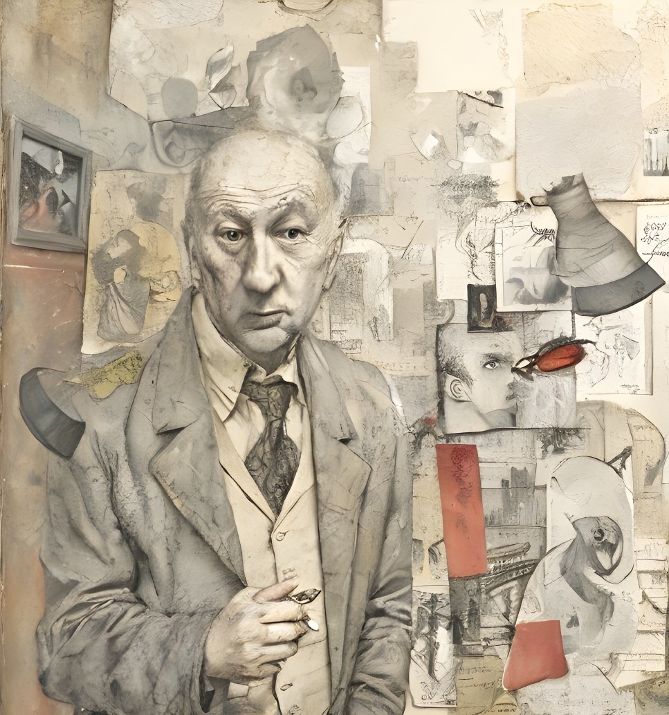 A person with intense gaze surrounded by a collage of various facial expressions and poses of the same individual.