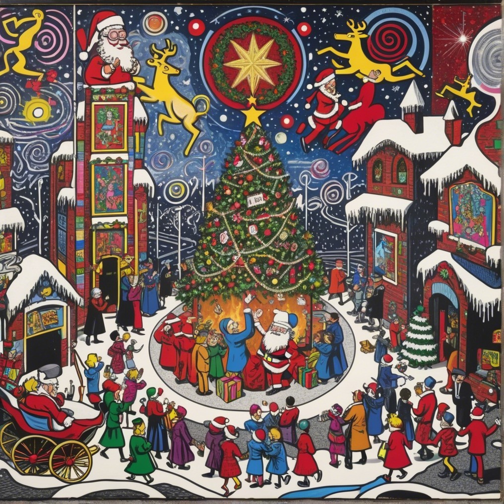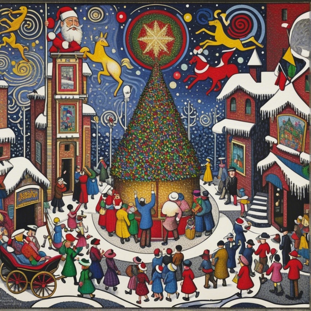 A vibrant holiday scene features a colorful Christmas tree in a snowy town square, with carolers, festive attire, Santa on the roof, and joyful townsfolk celebrating together.