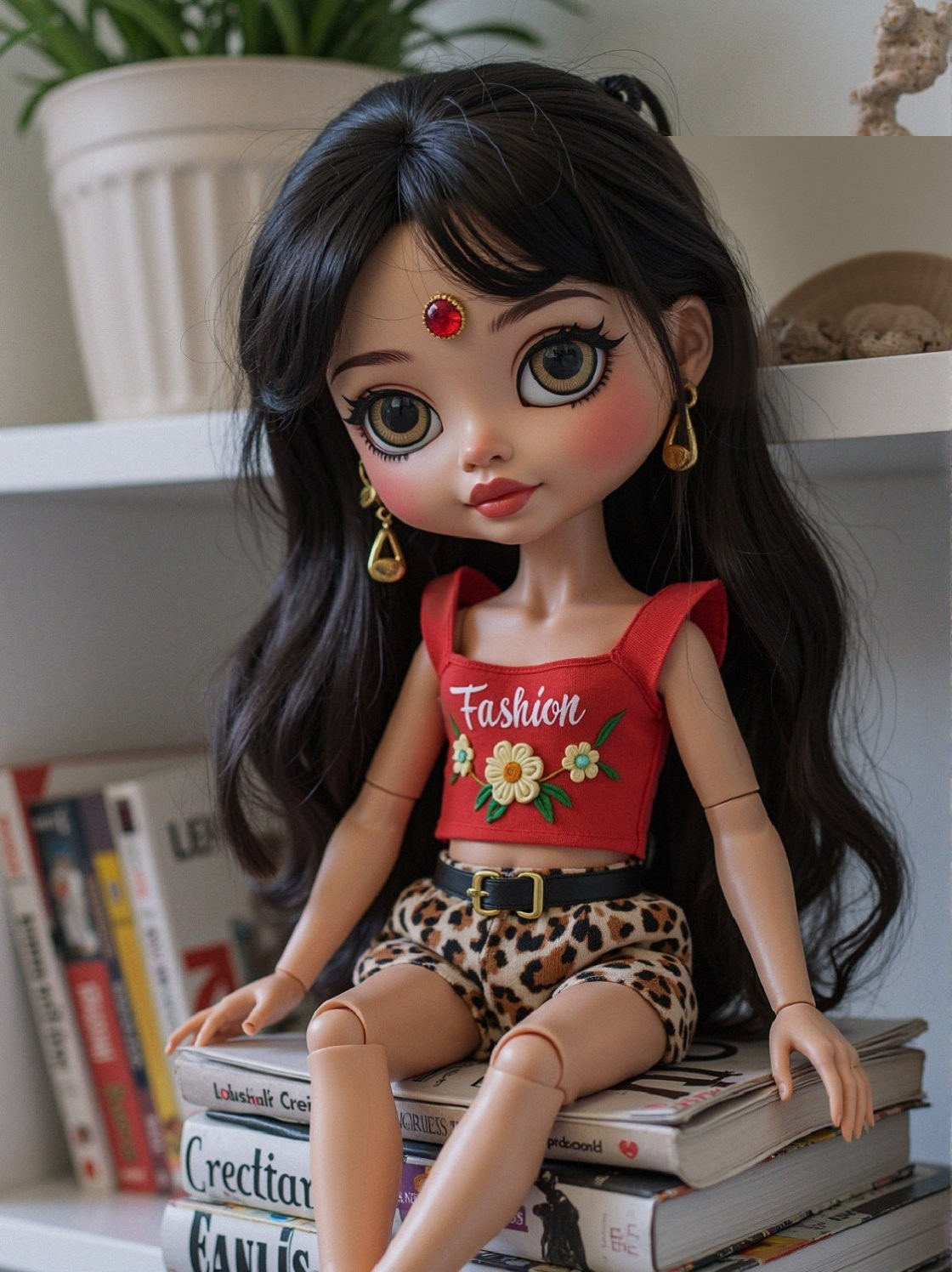The image features a stylish doll with long black hair and big eyes. She's dressed in a colorful outfit adorned with gems and patterns, exuding a glamorous and confident vibe.