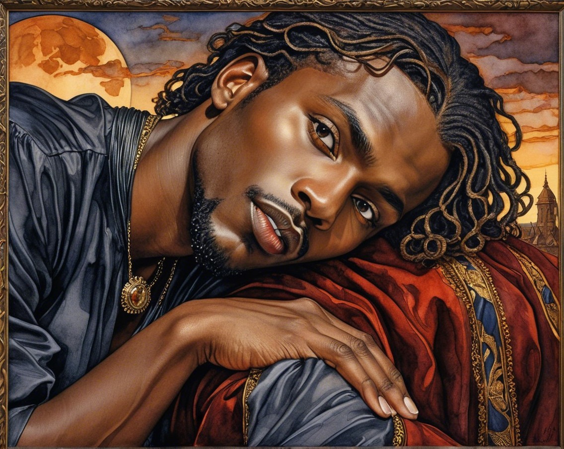 A regal figure with an elaborate hairstyle gazes confidently, adorned in costly jewelry and a deep red cloak, set against a backdrop of majestic castles and a golden sunset.