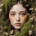 A close-up portrait of a young woman framed by tree bark and lush greenery. Her striking green eyes are adorned with golden accents and droplets, creating an ethereal, nature-inspired look.