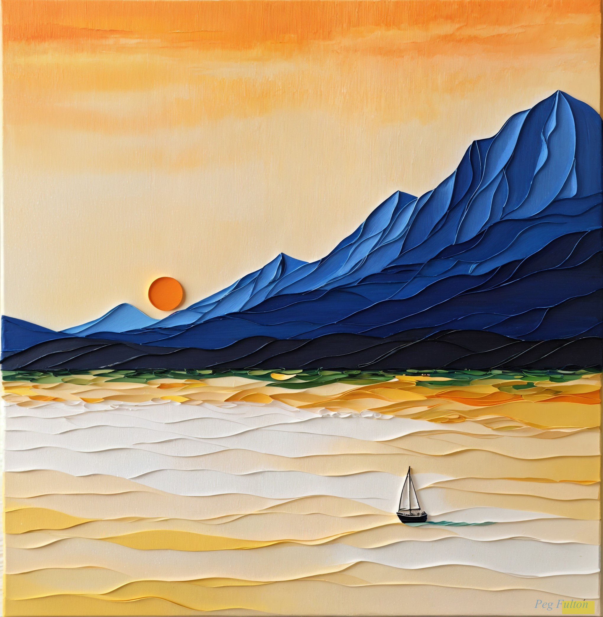 The image features a serene landscape with mountains under a warm sunset. A small sailboat glides across textured waves, while sandy hues blend with gentle blues and vibrant orange.