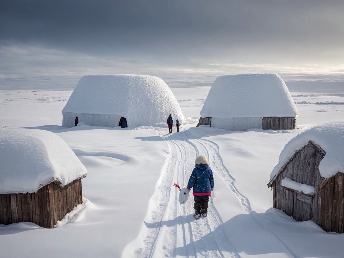 A snowy landscape features traditional dome-shaped structures. Two figures, one in a bright red coat and another in blue, walk along a path in the serene, wintery scene.