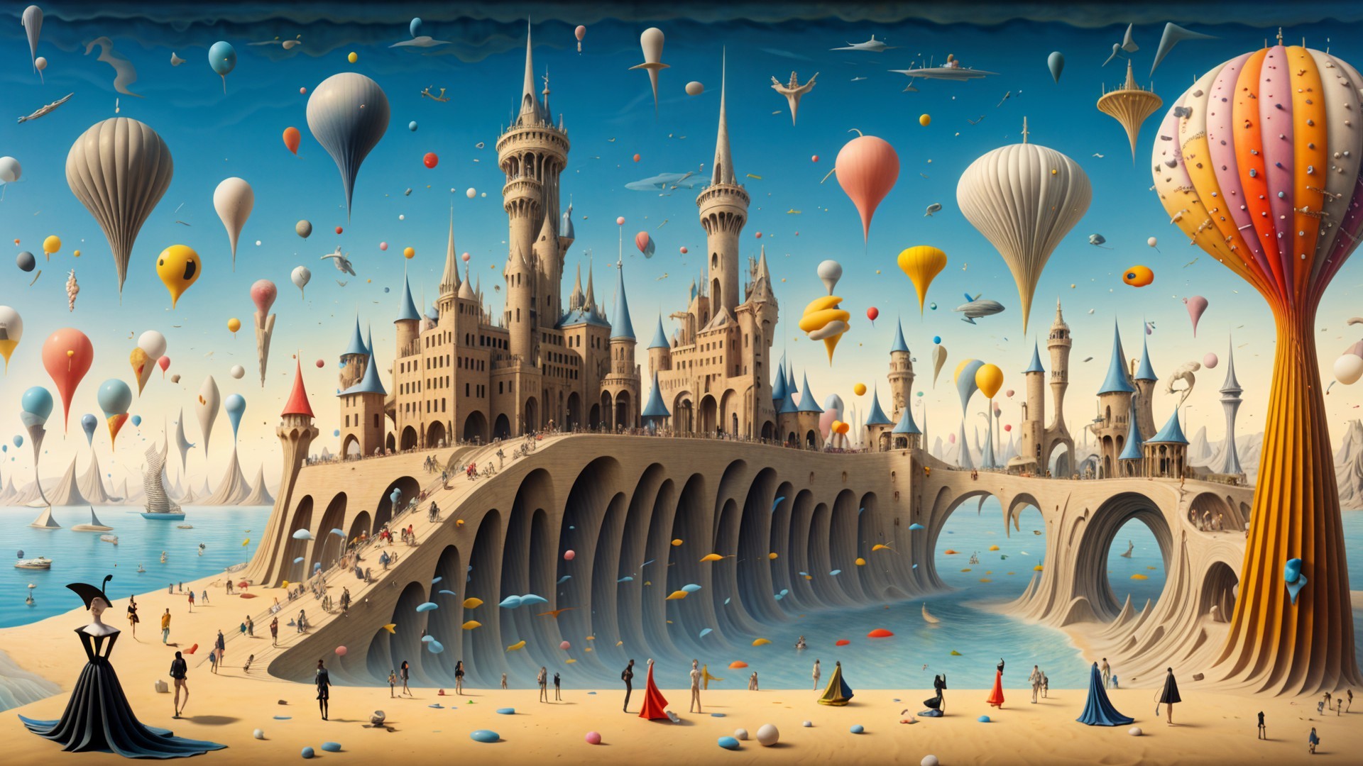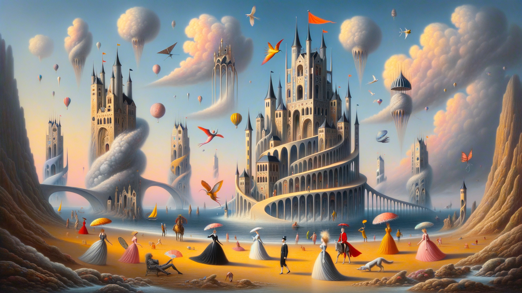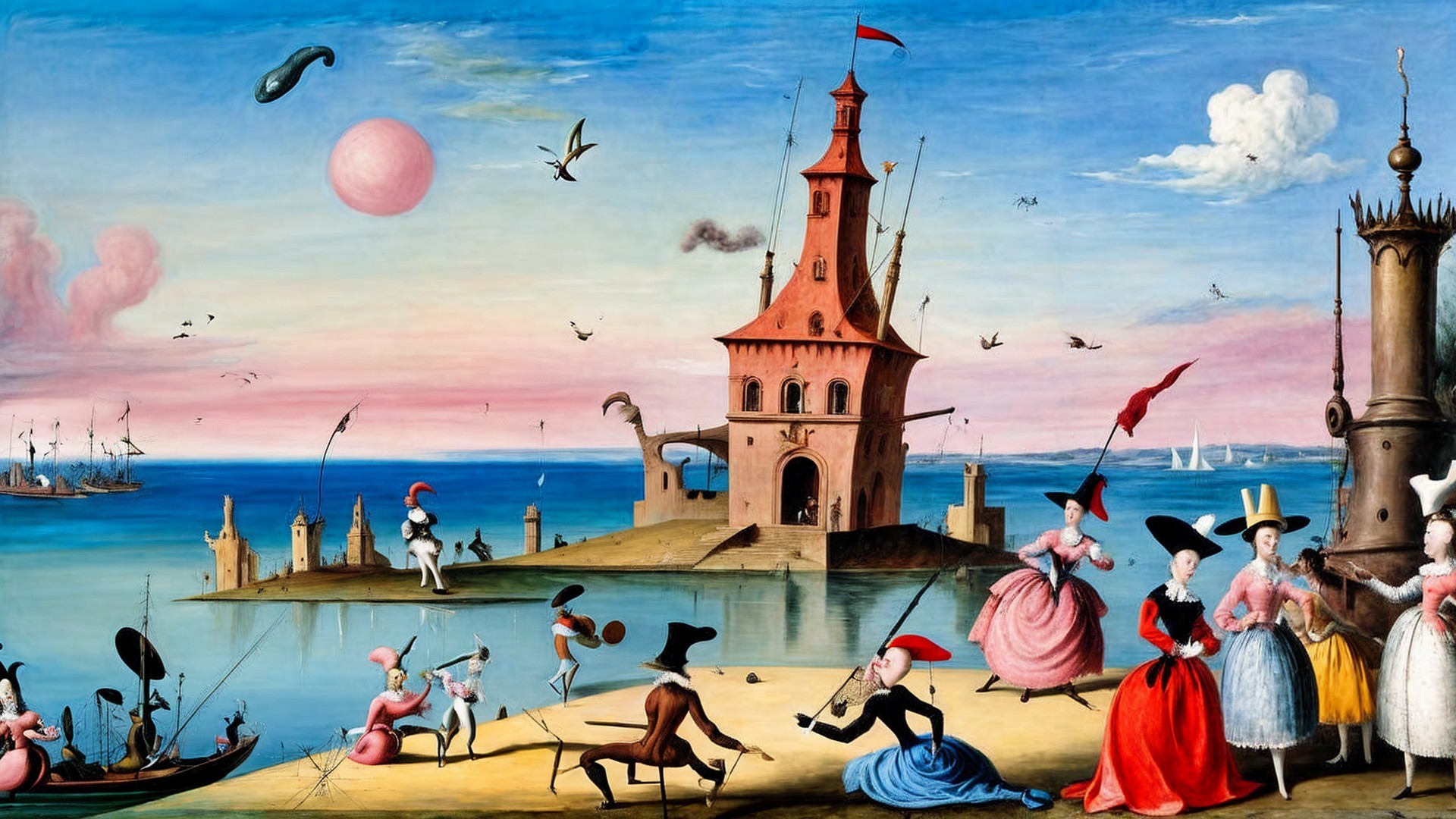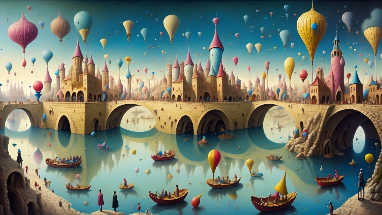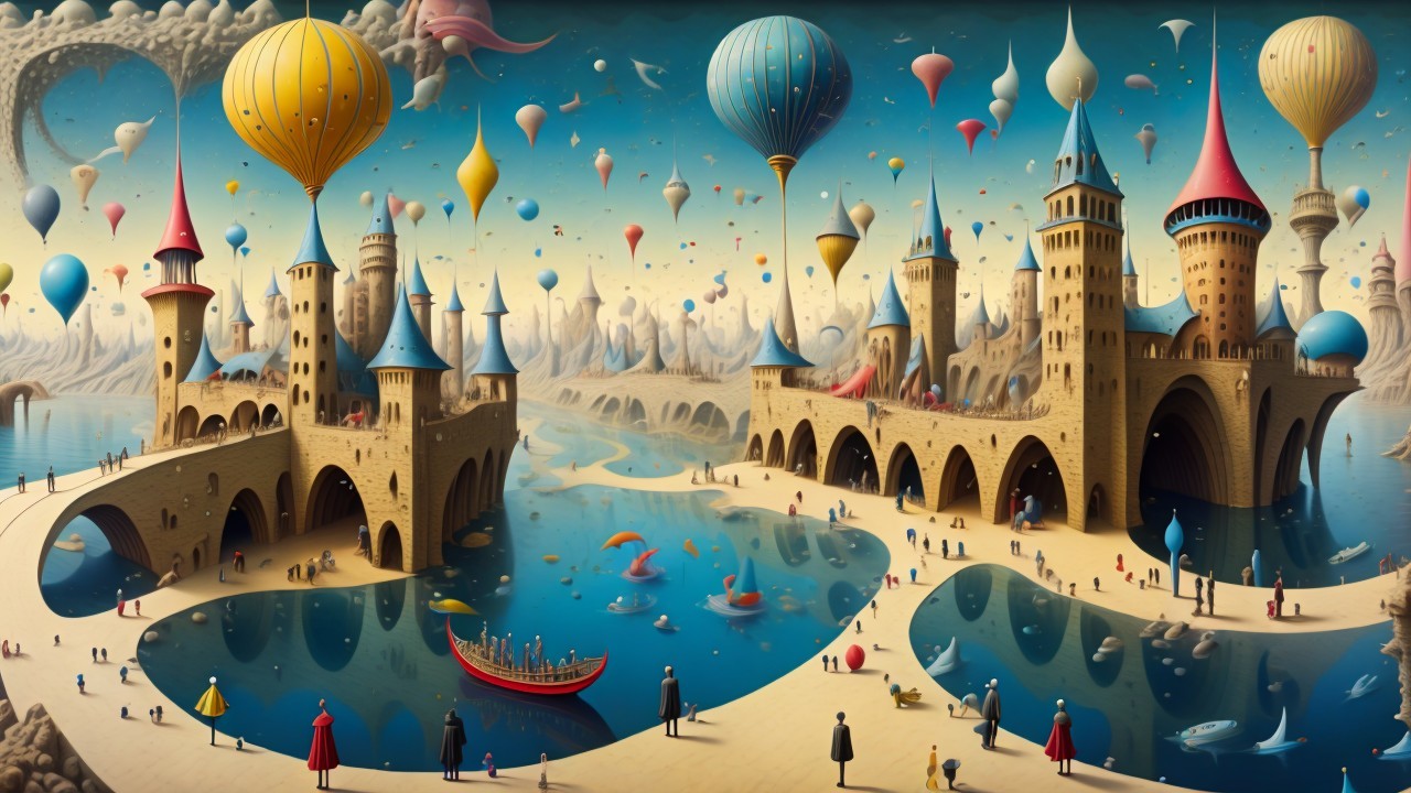 A whimsical landscape features colorful, fantastical castles and towers reflected in a serene river. People in elegant attire stroll along paths and navigate boats, surrounded by lush hills. Modock, is not a real place in American language. As a verb modock means to drive fast, as my father once said, "I was modocking on 45 when I threw a shoe." He meant that he was driving fast on Rt. 45 when he had a flat tire. Apparently there was also some ice involved.