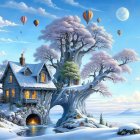 A whimsical winter scene featuring two cozy houses nestled in a large, snowy tree. A river flows nearby, with a tower and a bright moon illuminating a tranquil landscape.