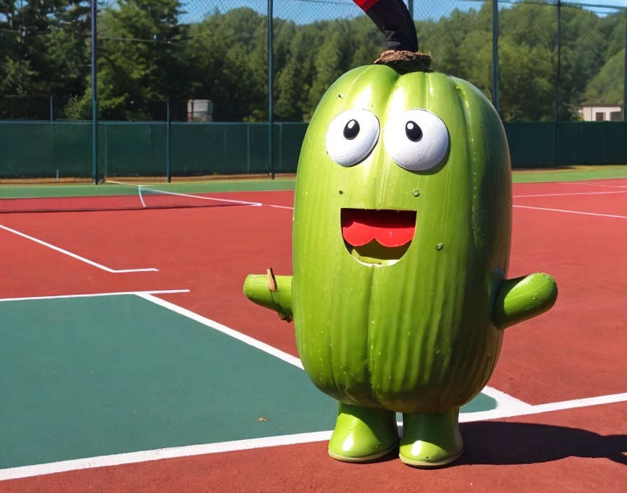 A cartoonish green pickle character with eyes and a mouth stands on a tennis court.