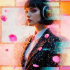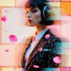 (Try from marek zarnovicky) - A stylish individual with a short bob haircut wears headphones and a sparkly blazer. The background features vibrant, abstract shapes and floating petals, creating a dynamic, colorful atmosphere.
