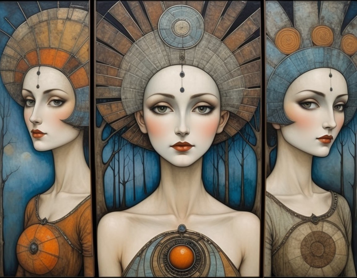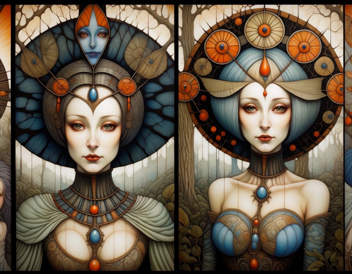 The image depicts two ethereal women with intricate, fantastical headpieces and expressive features. Their attire is adorned with jewels, set against a backdrop of nature-inspired patterns.