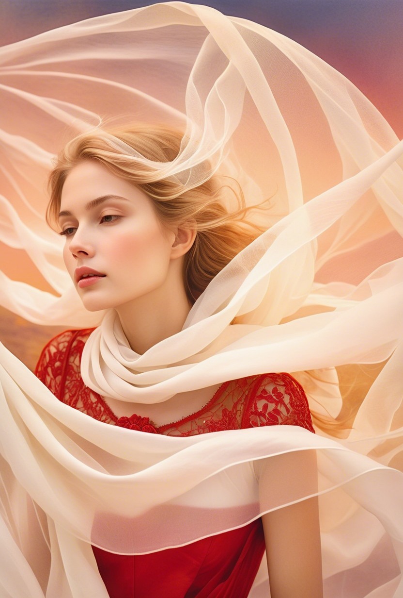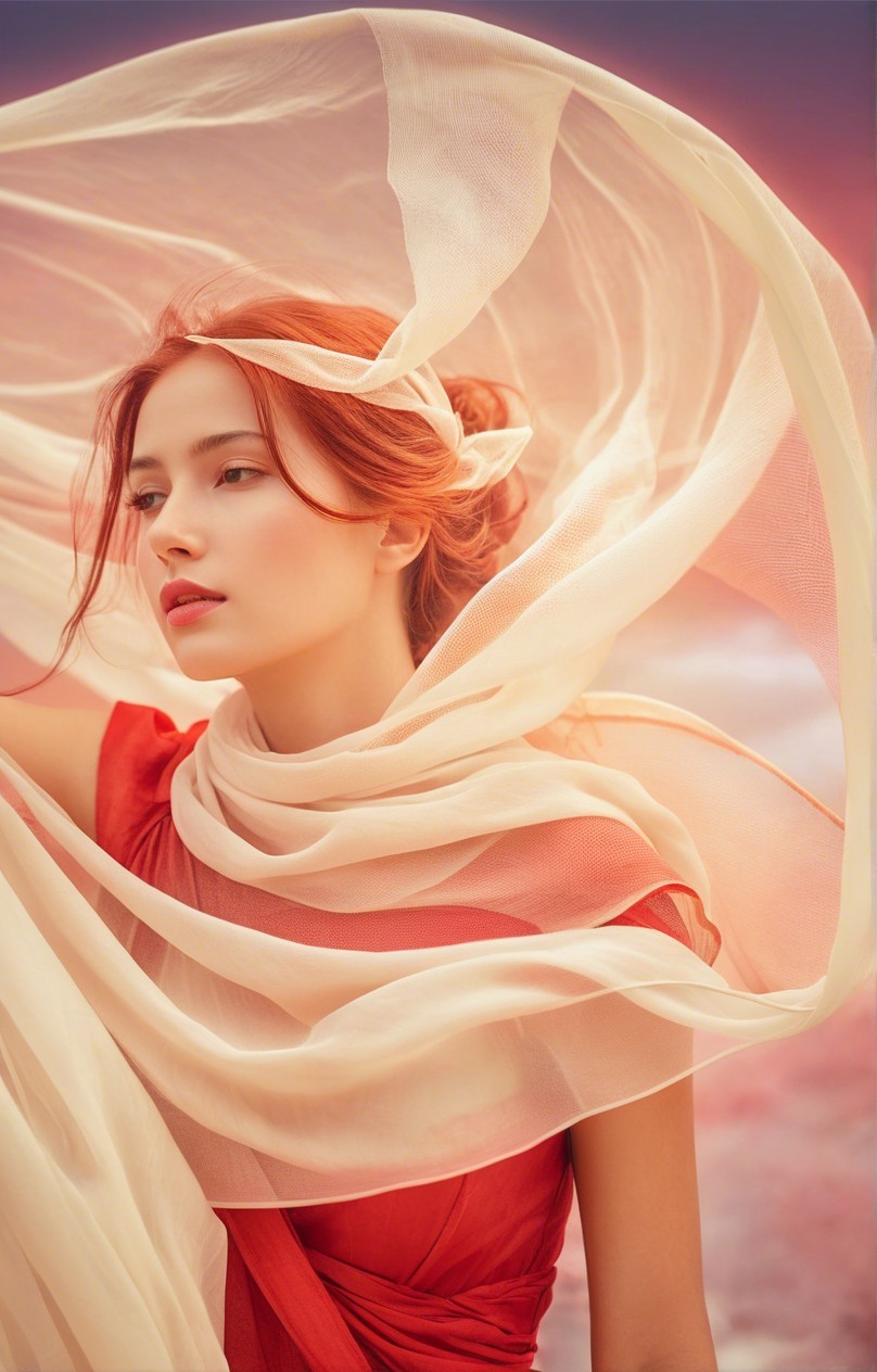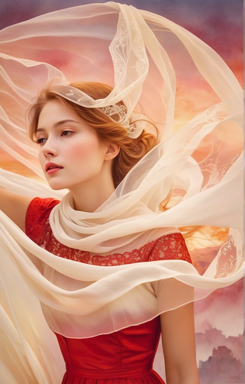 portraiture emerging from luminous landscape, where faint metallic structures fade into glowing white light. The sky with soft hues,, dreamlike atmosphere, while translucent white fabrics drift through the air, ethereal purity of the scene. Femsle Face is made of red fabric, decay, fantasy art, octane render illustration 1.5, subtle coloring, reddish-brown, stacked-up perspective, stylized lineage illustration, delicate coloring, pointillism, particles,