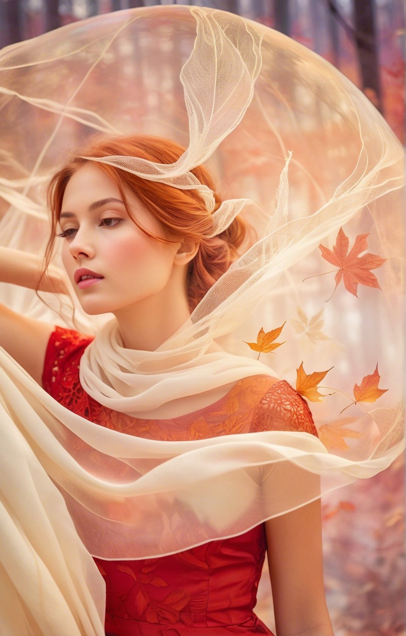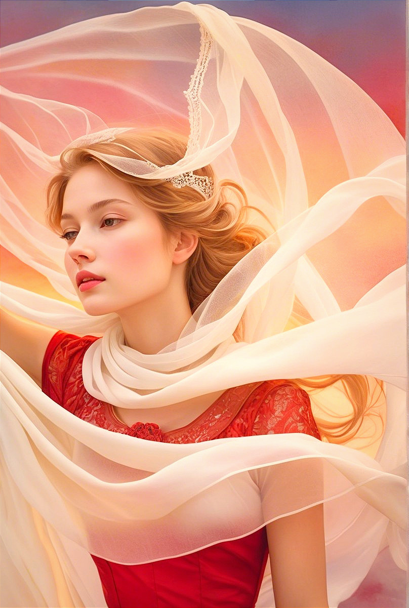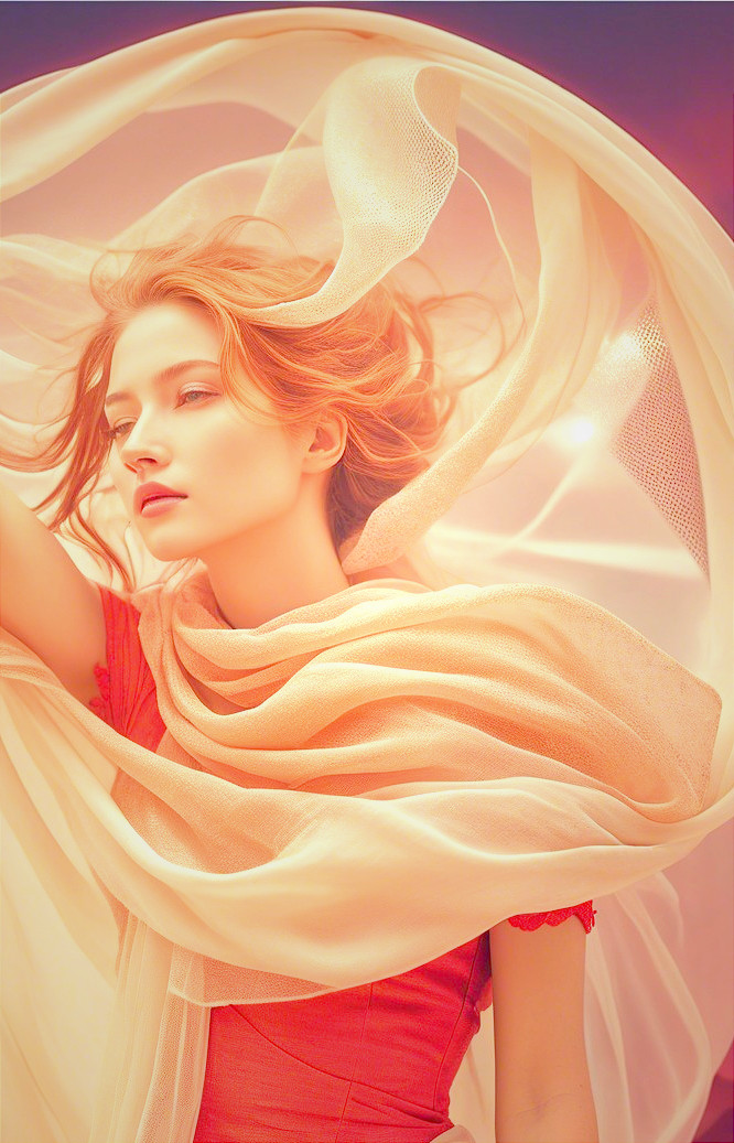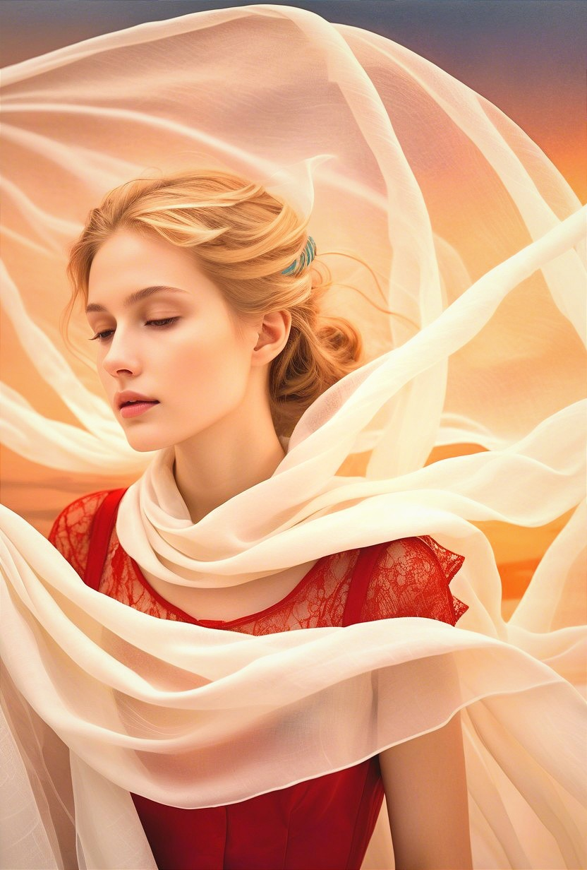 portraiture emerging from luminous landscape, where faint metallic structures fade into glowing white light. The sky with soft hues,, dreamlike atmosphere, while translucent white fabrics drift through the air, ethereal purity of the scene. Femsle Face is made of red fabric, decay, fantasy art, octane render illustration 1.5, subtle coloring, reddish-brown, stacked-up perspective, stylized lineage illustration, delicate coloring, pointillism, particles,