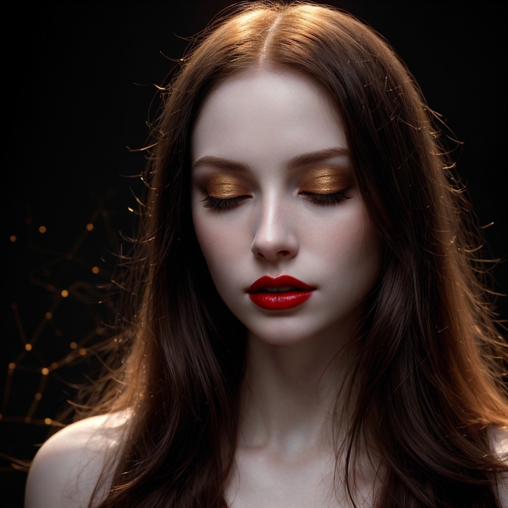 A stunning portrait of a woman with long, flowing hair and striking makeup. Her gold eyeshadow and bold red lips create a dramatic contrast against a dark background. Her expression is serene and captivating.