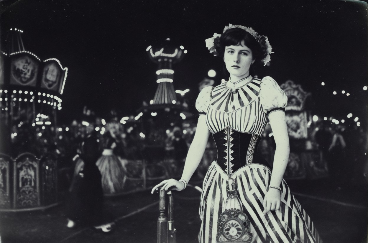 Vintage photo of a woman in striped dress at a night carnival with rides and lights in the background.