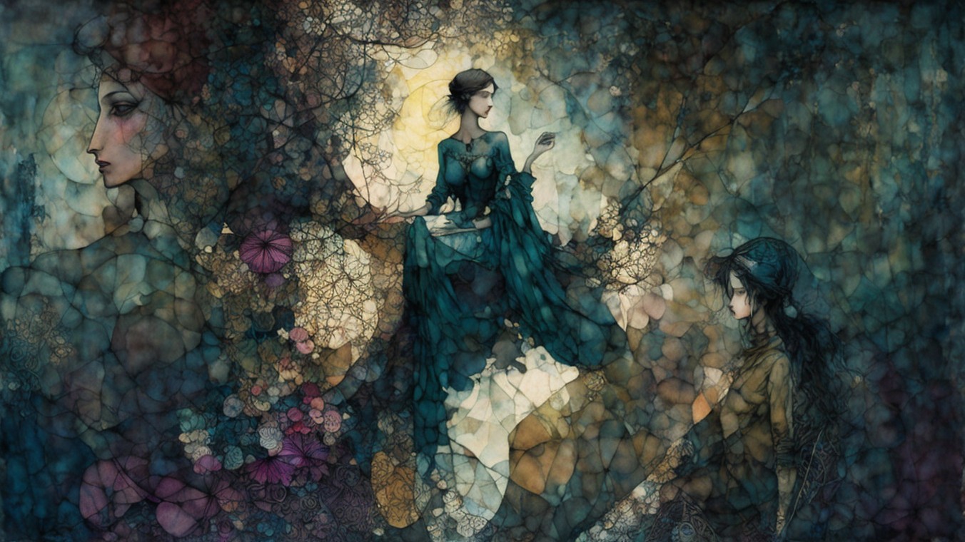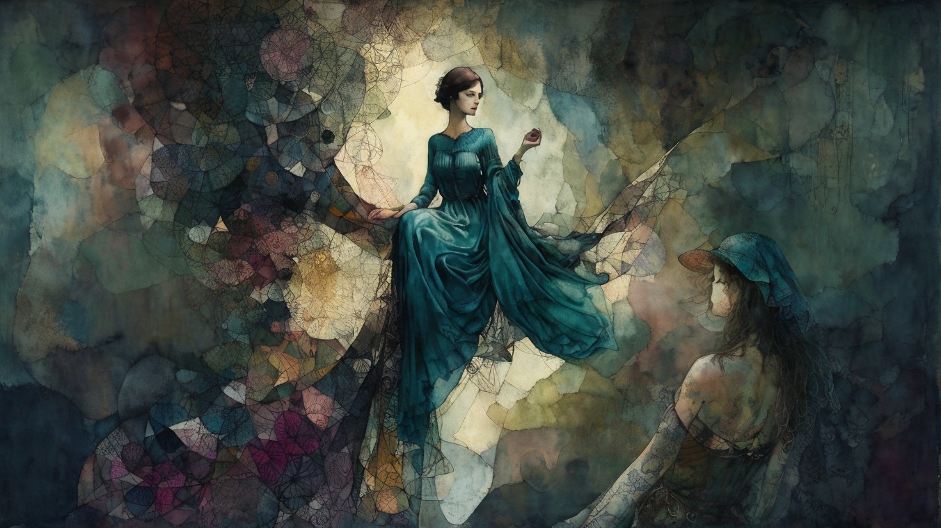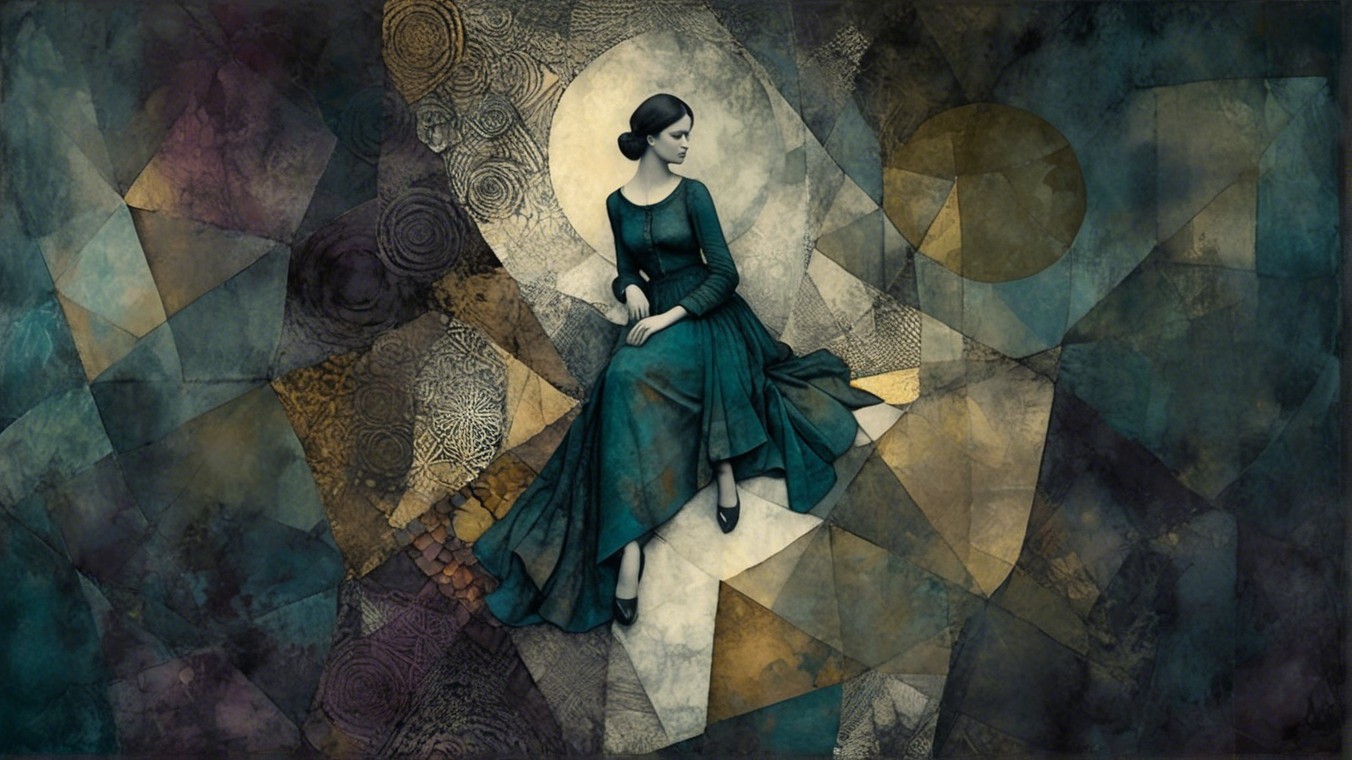 A serene woman in a flowing dress sits gracefully against a backdrop of colorful geometric shapes, blending tones of blue, green, and gold with a textured, artistic feel.