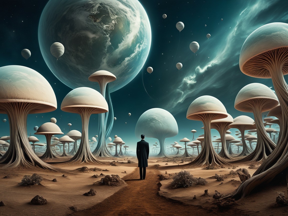 A surreal landscape with giant mushrooms, a distant planet, and a lone figure. The mushrooms have light-colored caps, some with a subtly cracked or textured appearance, and intricately detailed, root-like stems that spread out at the base into the sandy, reddish-brown ground. Some stems are very