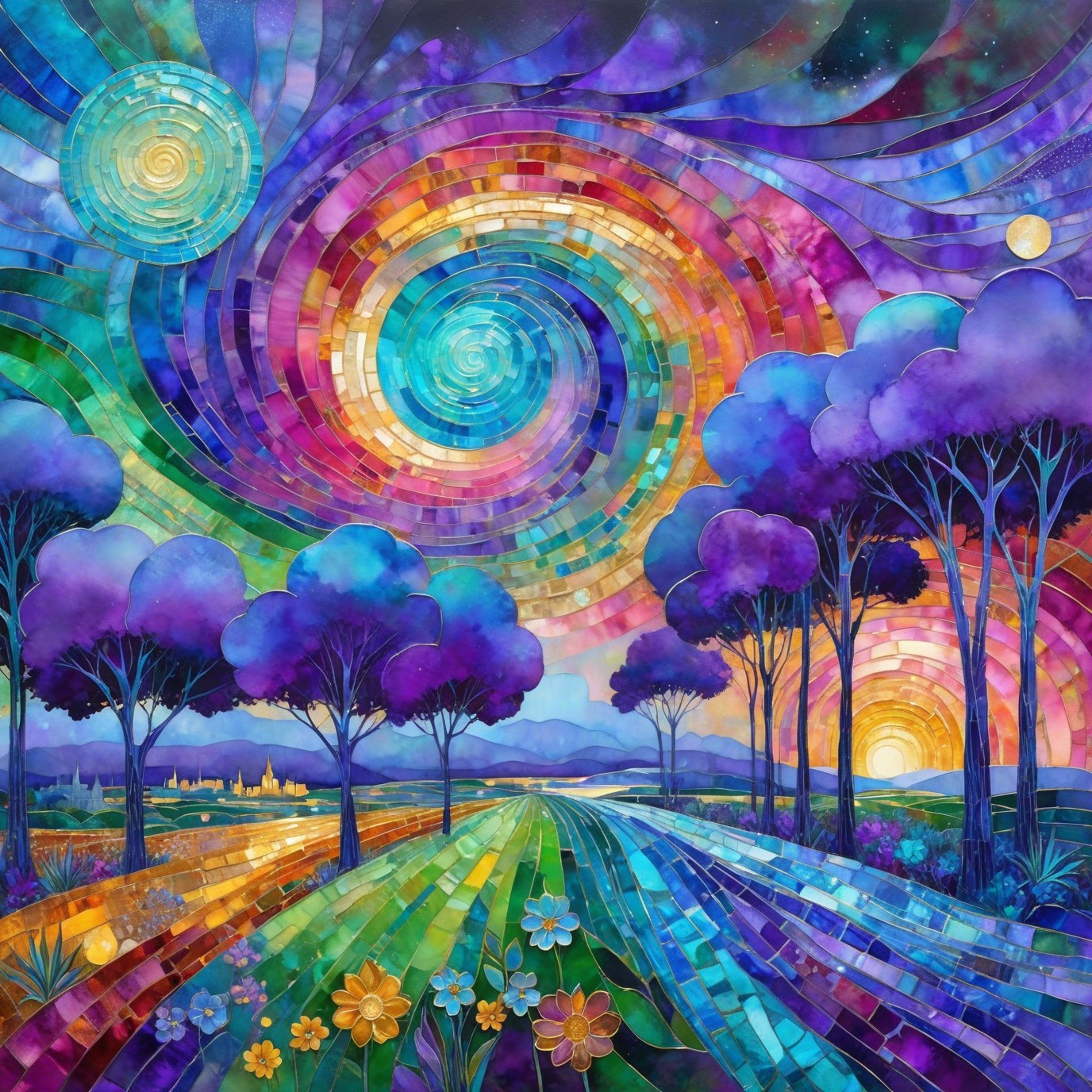 A stunning stained glass interpretation of a colorful landscape, depicting a vibrant sky with swirling patterns of blues, purples, oranges, and yellows, resembling a cosmic vortex or a mesmerizing sunset. In the foreground, a winding path in shades of green, blue, and purple leads towards a distant horizon. Several