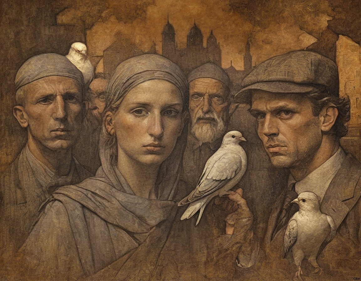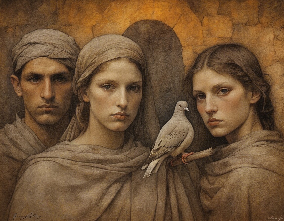 A trio of solemn individuals in ancient garb, with a serene, reflective ambiance and a medieval cityscape at sunset in the backdrop.
