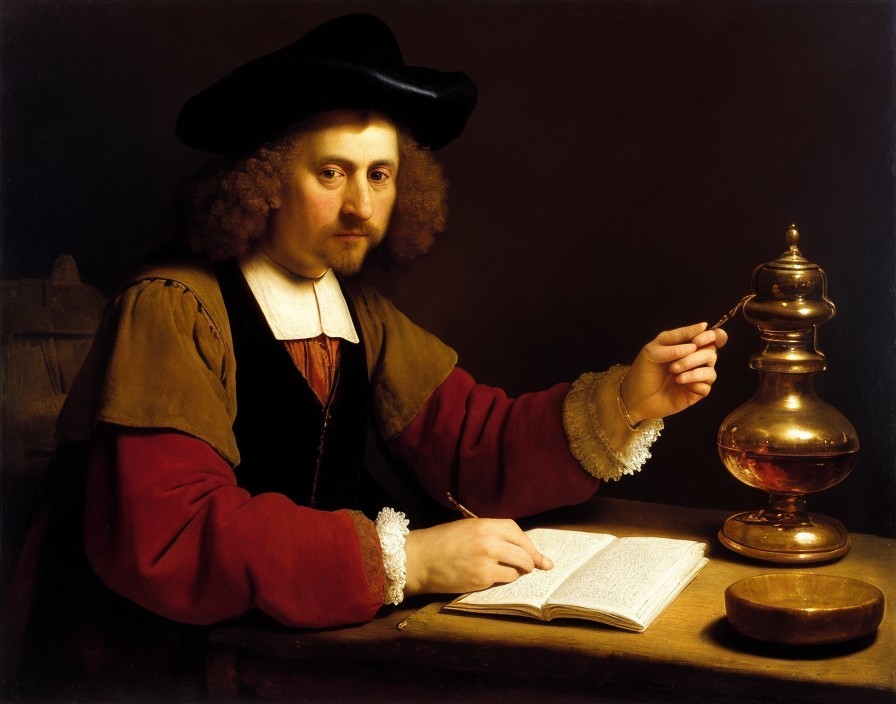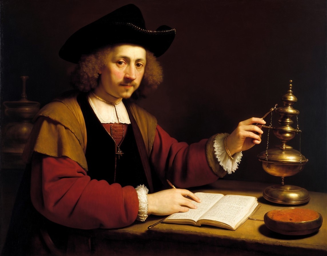 A portrait of a man in 17th-century attire with a wide-brimmed hat, standing by a table with an open book and a brass object.