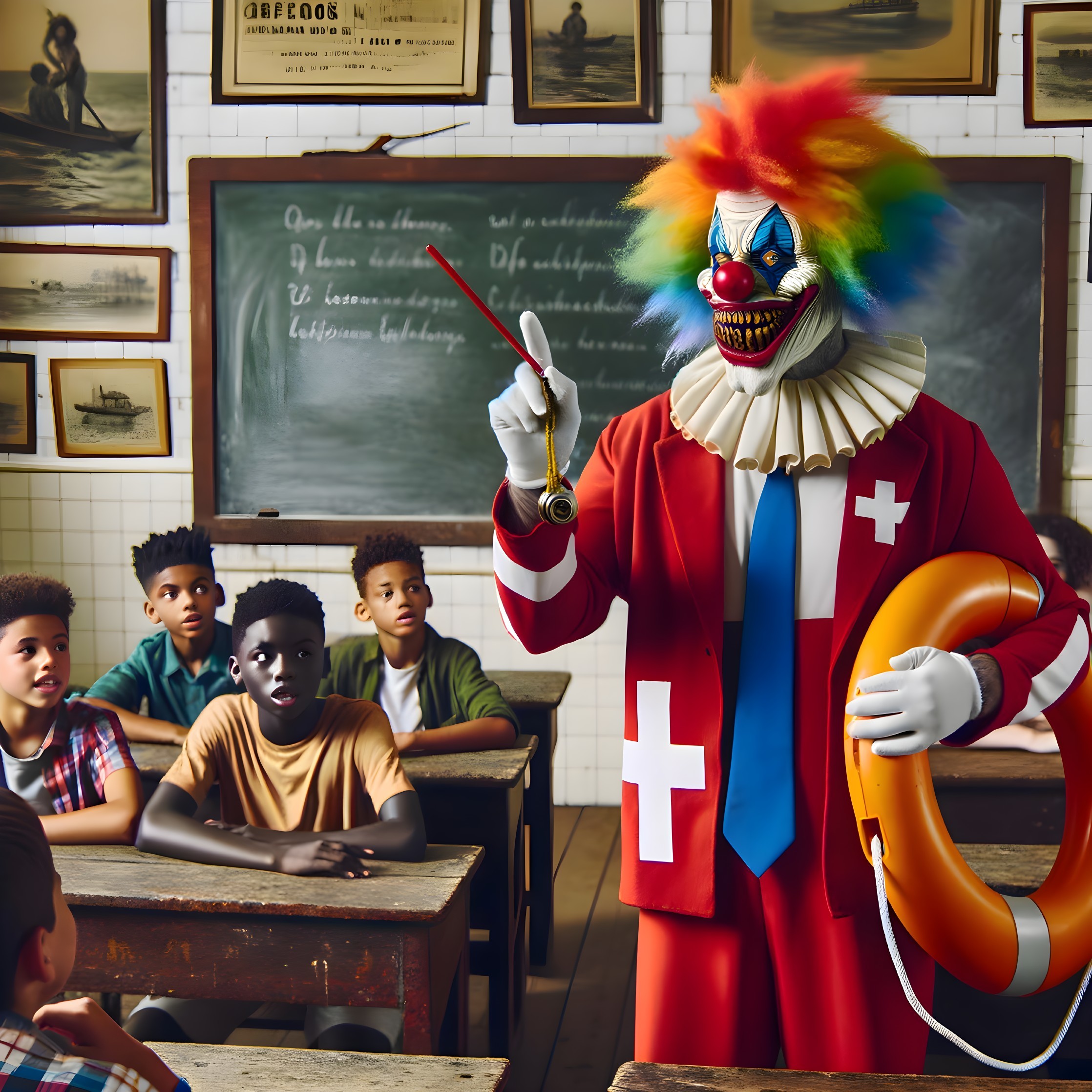 A creepy clown in lifeguard attire educates 19th-century kids on lifejackets in a classroom setting, blending humor with safety awareness in an unusual scenario.