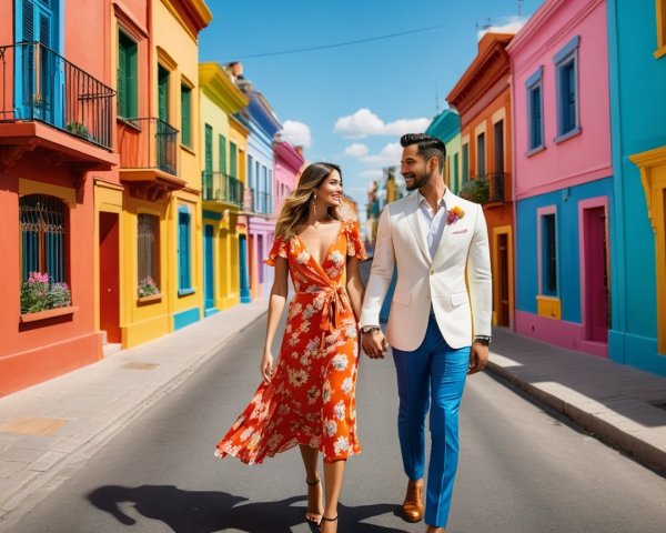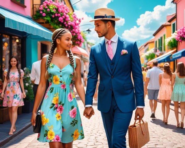 A serene countryside scene with a cozy stone house and a smaller cabin nestled among lush trees and vibrant flowers. A majestic horse stands on a path, illuminated by warm sunlight.