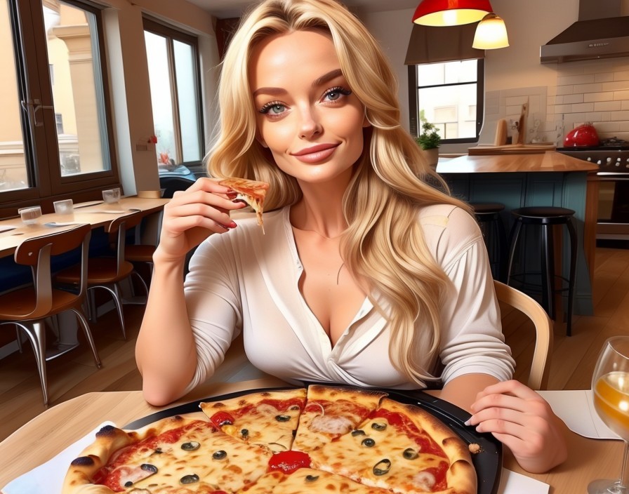 Stylish Woman with Pizza in Cozy Kitchen Setting