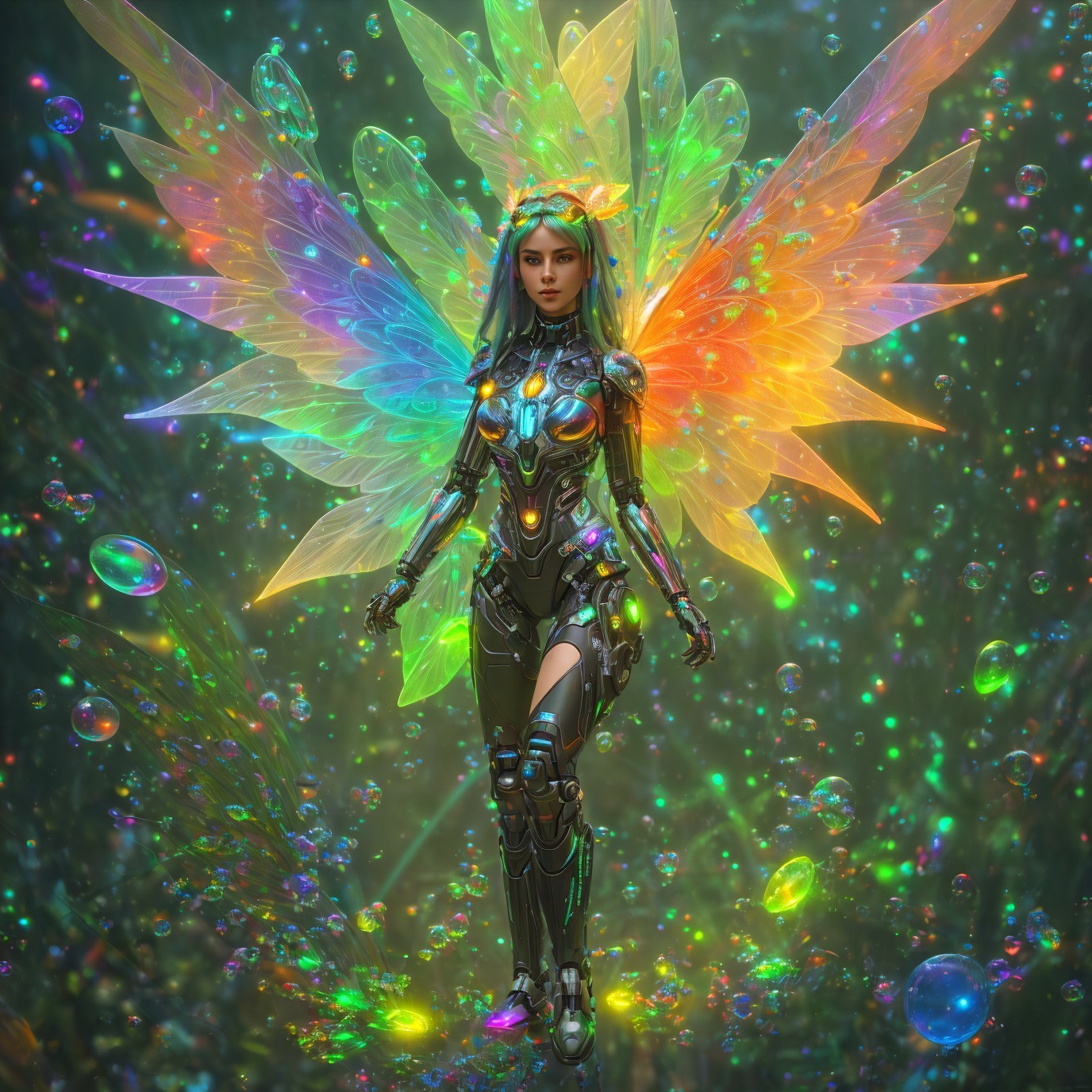 A humanoid futuristic cybernetic fairy with glowing neon fractal spiraling wings