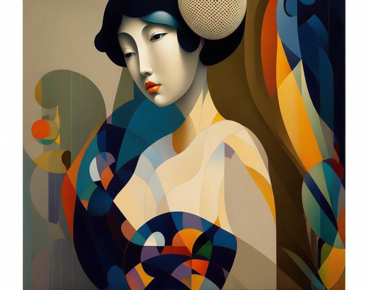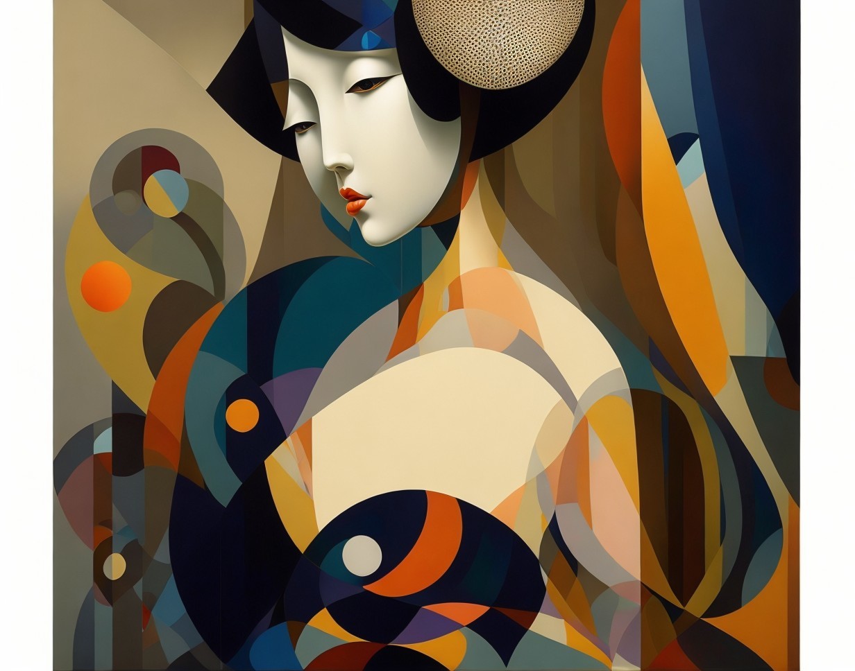 A stylized, abstract painting of a woman with flowing patterns and shapes in a mix of earthy and muted tones.
