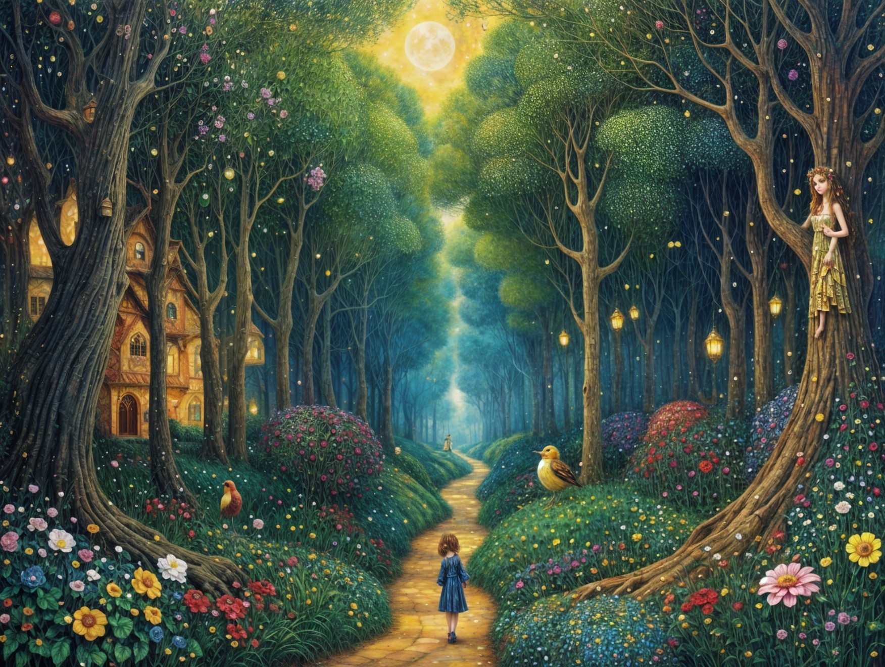 A whimsical forest scene featuring a young girl in a yellow dress, surrounded by vibrant trees, colorful flowers, and playful birds. A quaint house peeks through the greenery under a serene sky.