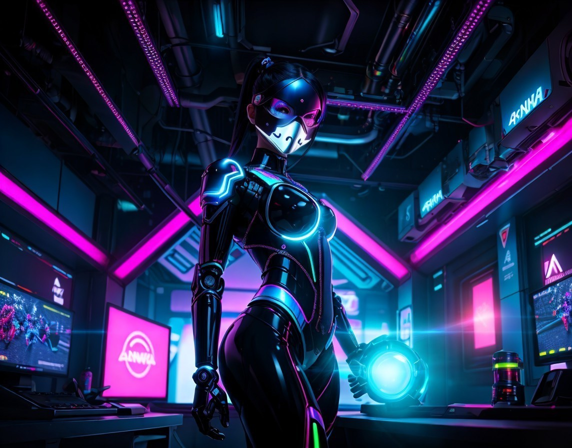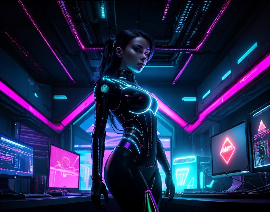 A masked and cybernetically enhanced woman stands holding a technological marvel. She is framed by the intensely vivid lights of the computer stations around her.