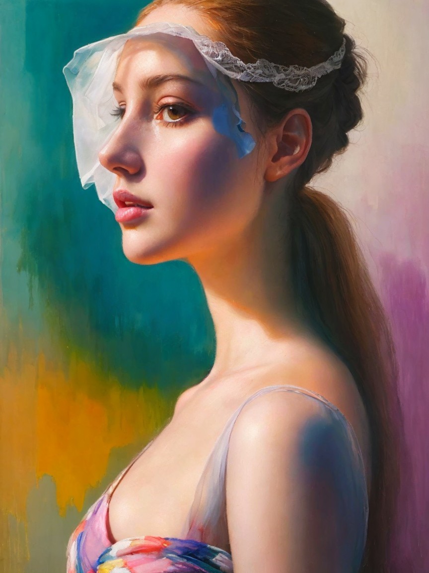 A serene portrait of a young woman with a delicate veil draped over her face, highlighting her graceful profile. Soft colors blend in the background, enhancing her ethereal beauty and calm expression