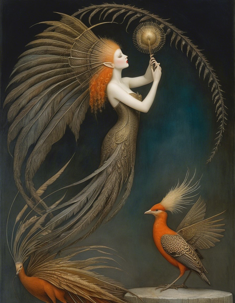 A mystical being with long, flowing hair and intricate feathered adornments holds a glowing orb. Beside her, a vibrant orange bird with elegant plumage stands, creating a surreal, enchanting scene.