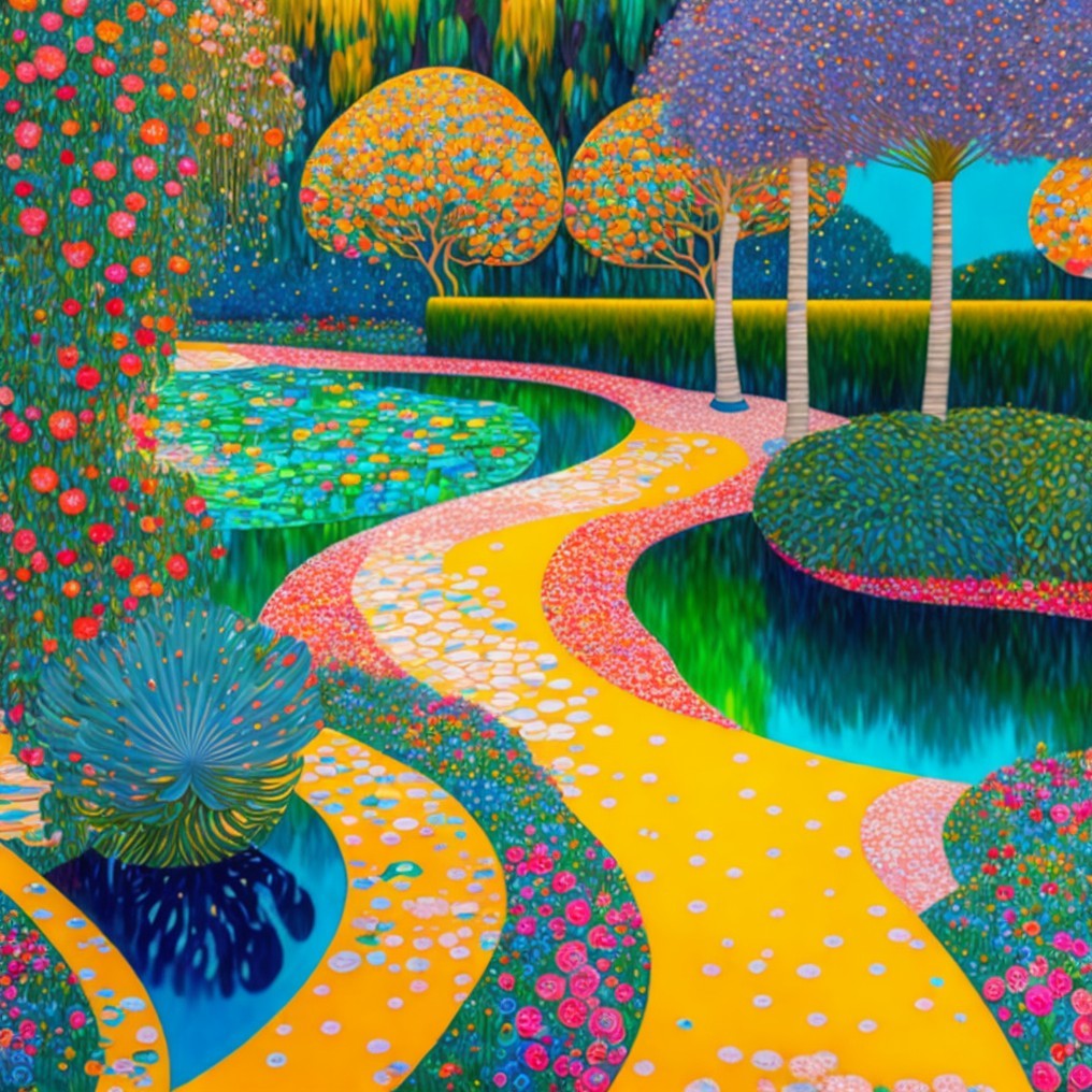 Prompt: "wide view, 3D Acrylic painting in the very best style of Gustav Klimt of a beautiful garden with numerous tropical flowers with vibrant spectacular colors, lemon trees and cherry trees, and plants with leaves in shades of azure blue and teal, golden sunset rays shimmering over the scene, detailed intricate, satiny, high quality, shimmering, elegant, highly detailed, glistening magic style with elements in the style of Jan Toorop"