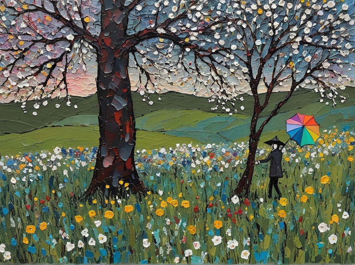 A vibrant landscape features blossoming trees and a colorful field of flowers under a pastel sky. A silhouetted figure holds a bright, rainbow umbrella, enjoying the serene beauty of nature.
