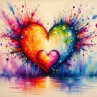 A vibrant watercolor painting featuring three colorful heart shapes surrounded by splashes of paint, reflecting on a calm surface, creating a joyful and serene atmosphere.