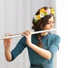 A painterly digital art portrait features a beautiful, serene young woman playing a silver flute, shown from the chest up, against a vibrant, soft-focus background of colorful, vertical brushstrokes in shades of peach, pink, purple, and blue. The woman has light skin, prominent cheekbones,