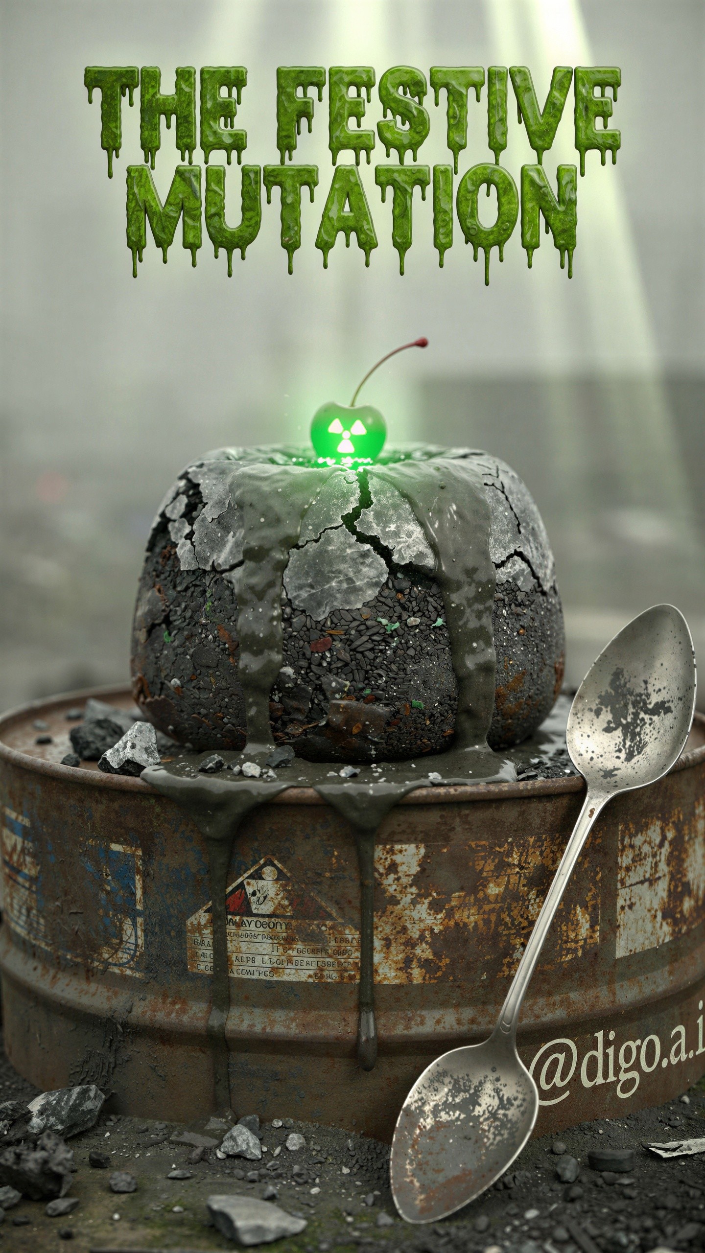 A dark, grungy, and surreal image features a rusted metal barrel serving as a stand for a black, cracked, and lumpy bundt cake, or a similar round celebratory dessert. The cake is covered in a thick, dark, glossy liquid that drips down its sides onto the barrel and the ground