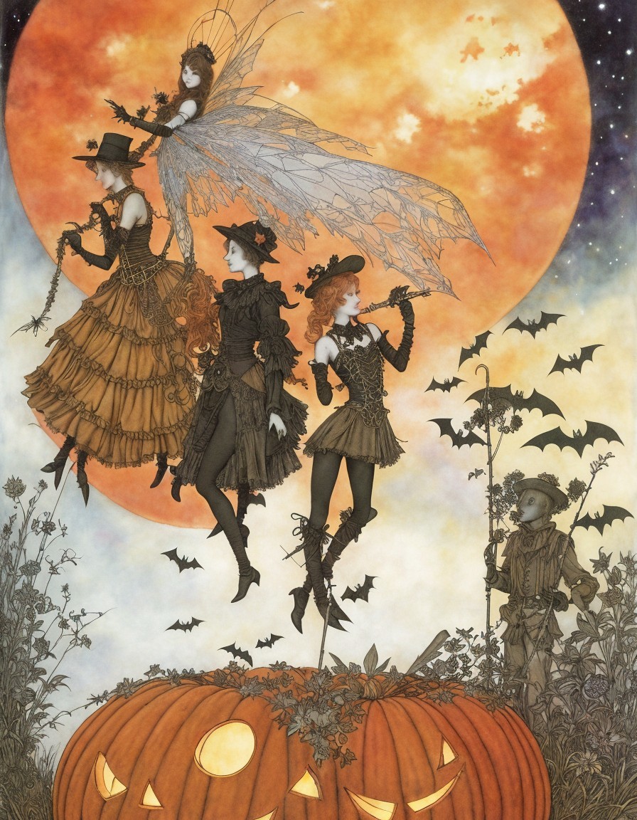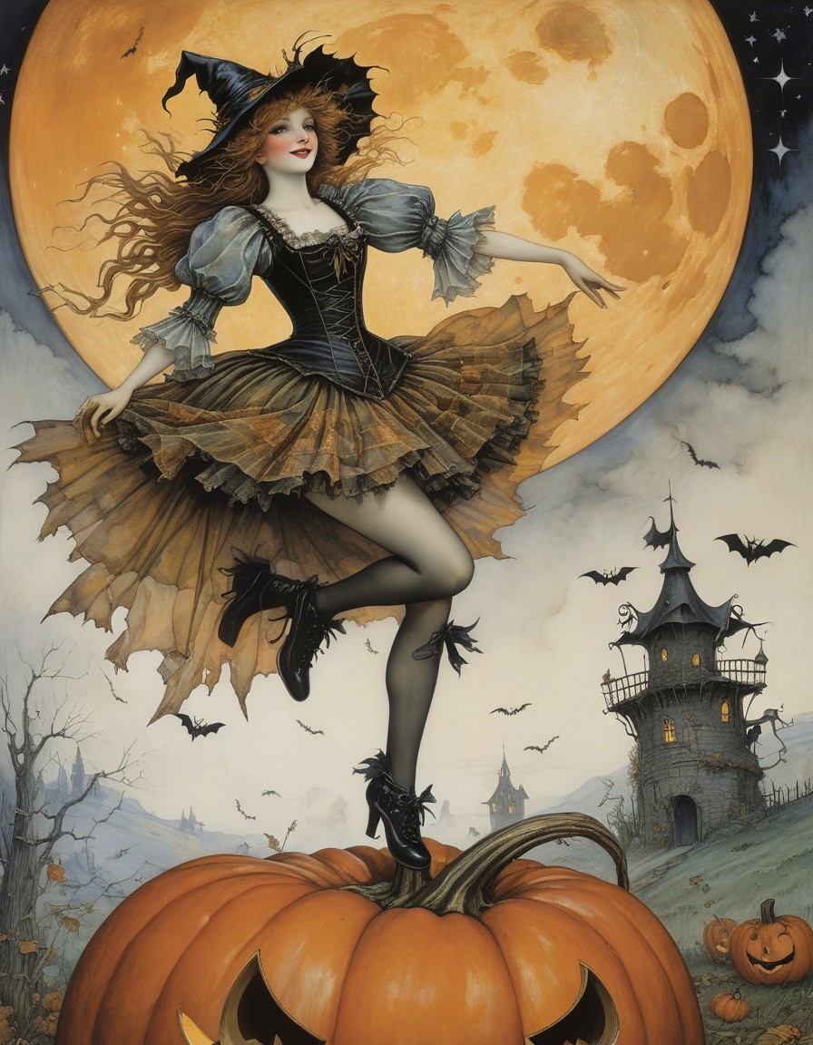 A whimsical witch dances joyfully under a glowing full moon, surrounded by carved pumpkins and a spooky castle, embodying the festive spirit of Halloween.