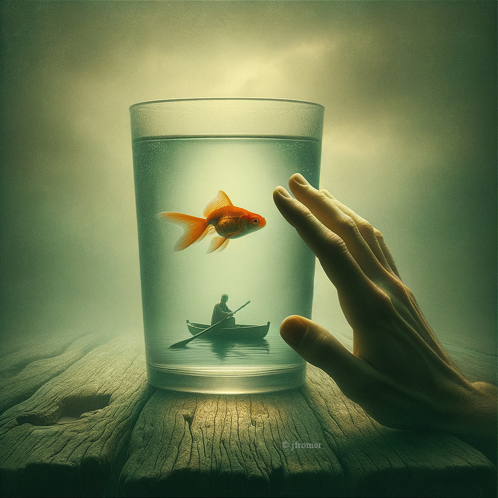 A surreal image depicting a small boat with a person on a wooden surface, a giant hand touching a glass holding a goldfish, creating a whimsical scale contrast.