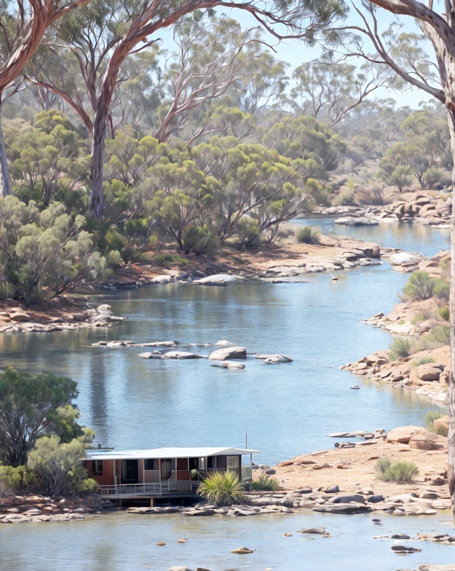 A serene river scene with a floating house, people on the shore, a boat nearby, surrounded by lush trees and rocky cliffs.