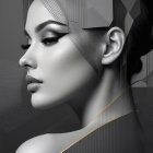 A striking portrait of a woman in profile, featuring elegant features and bold makeup. She wears a red dress against a monochromatic cityscape background, exuding confidence and allure.