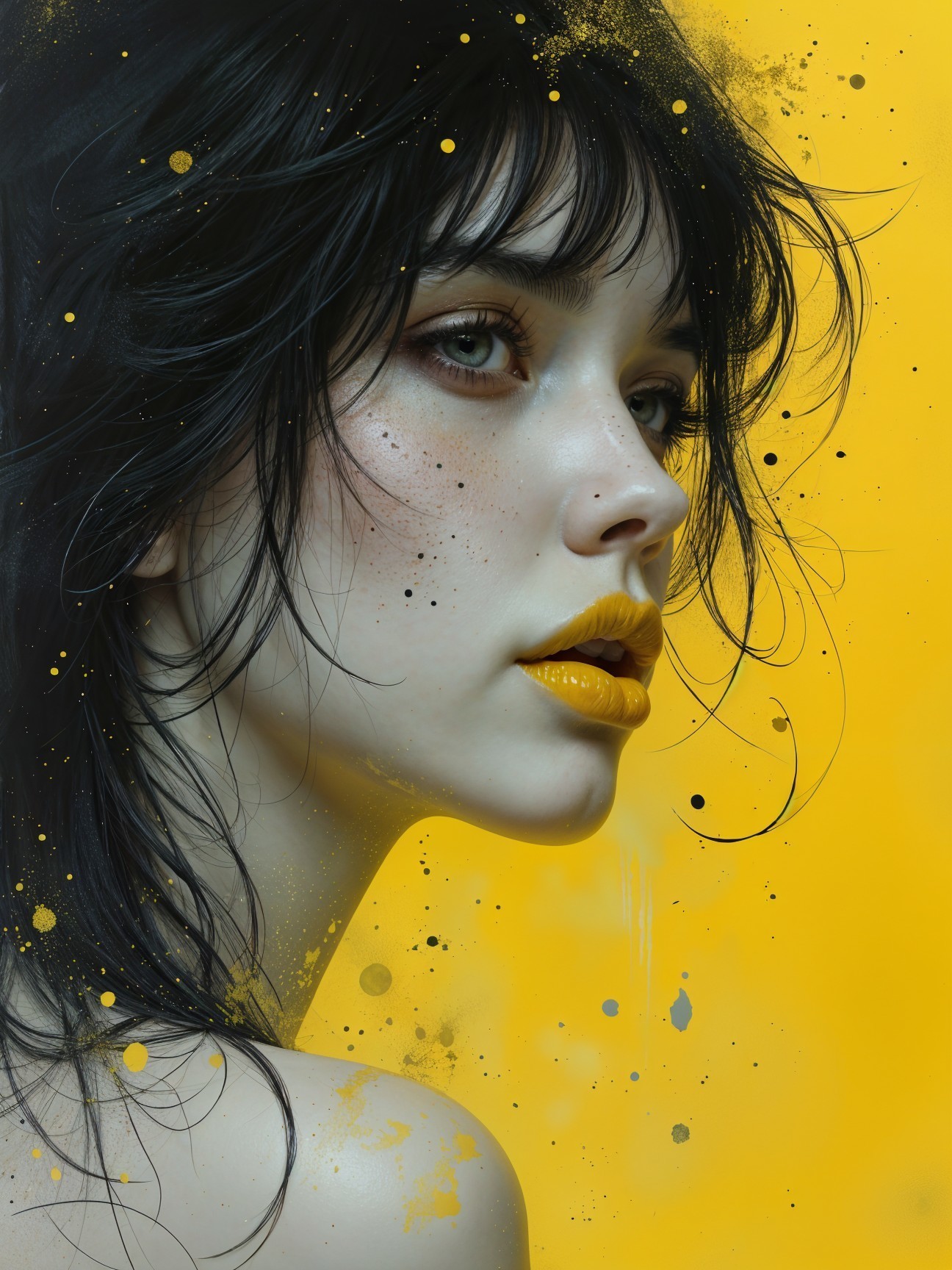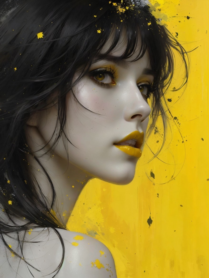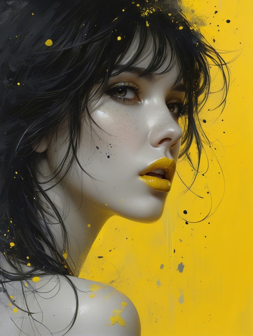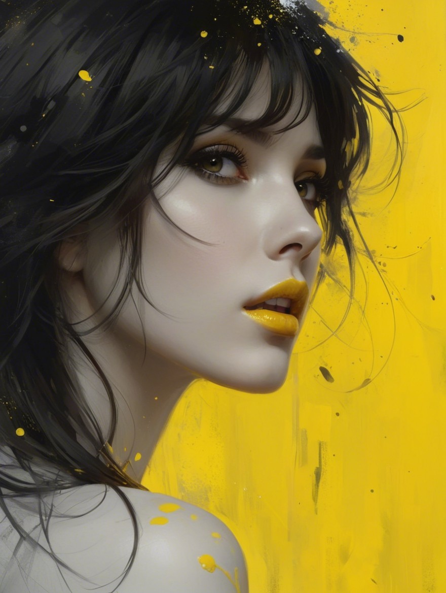 A stunning portrait of a young woman with dark hair and striking features, set against a vibrant yellow background. Her lips are painted in a bold yellow, enhancing her captivating gaze.