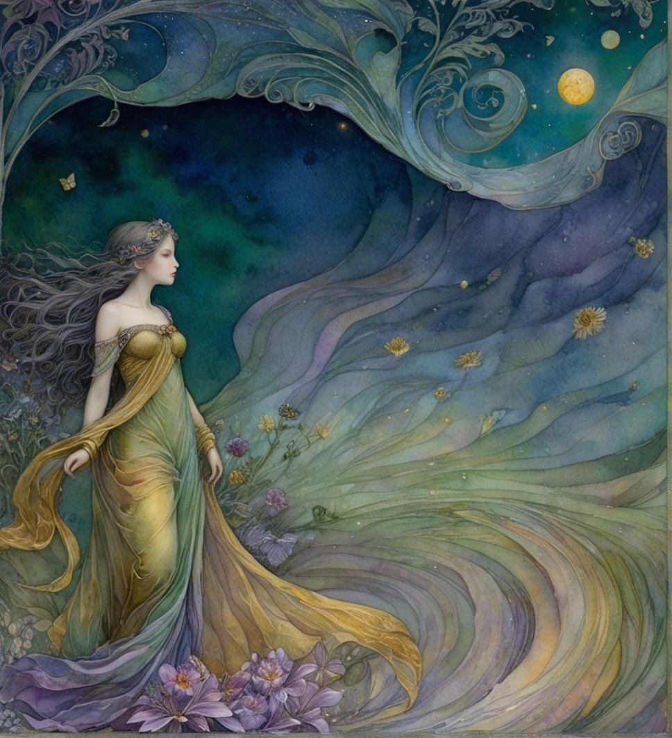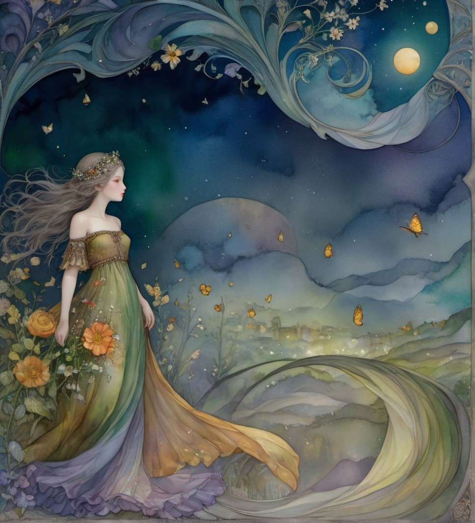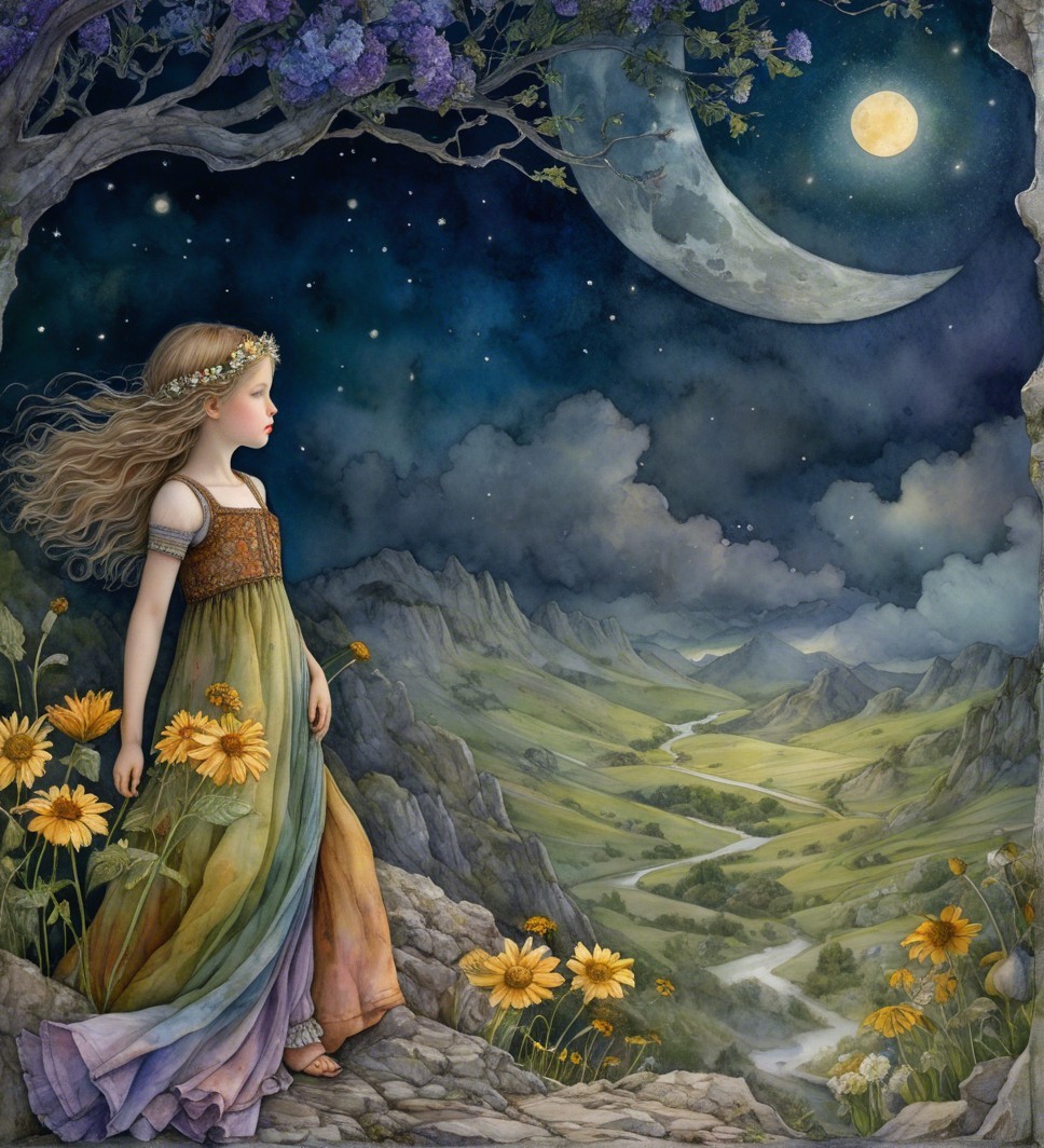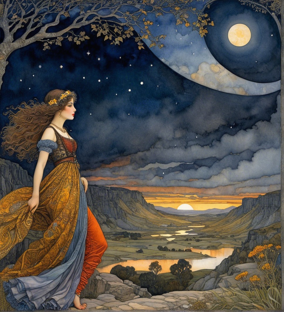A woman in vibrant attire stands by a scenic river under a luminous moon. The dark sky transitions to twilight, surrounded by mountains and a tranquil village, creating a mystical atmosphere.