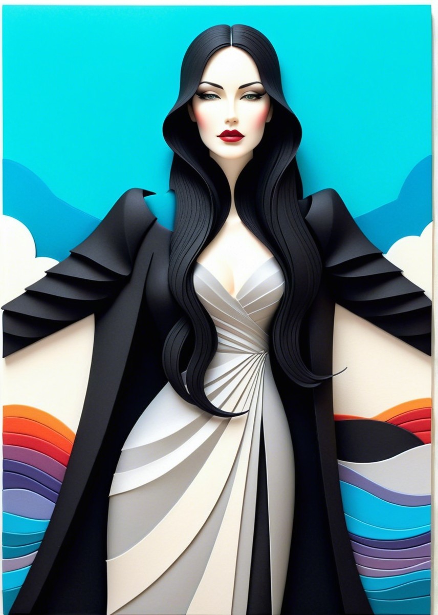 serene Gothic woman, textured with hatching details, resembling the style of Ann Telnaes, full-width papercut, featuring a beautiful and detailed scenery. Focus on creating an illusion of flowing hair with sculpted bas-relief effects, incorporating metallic colors and an extremely colorful palette. Executed with intricate textures by Overton Loyd, Man Ray, and Dee Nickerson, blending iridescent pastel colors. frontal view, dynamic flowing fabric, tesselated, elegant, extremely detailed, beautiful, award winning, high definition, crisp quality, hdr, 8K, meticulous, paper art, Infuse traumacore elements for a dark Gothic twist, ensuring crisp quality and HDR enhancement at 64K resolution. Explore paper art techniques, envisioning a dark fantasy inspired by Ilya Zomb with a top-to-bottom view and abstract coherence. Employ a wet-on-wet technique for a textured appearance, integrating geometric shapes in a layered, tessellated manner for background. Add stippled details with a baroque flair, and include cel-shaded forestal elements in a fantastical setting. Embrace surreal wet-on-wet painting with intricate linework, patchwork tessellation, and a blend of American Gothic influences. Cel-shaded, uhd, hdr, precise gelsculpt 64 k, vfx-inspired. Utilize fractalization and raytraced shadows for depth, along with a vibrant color palette of warm blue and saturated tones. Whimsical and imaginative realism, blurred portrait with intricate line art, tall and lean figures with tessellated, sculpted, cel-shaded, stippled, and blotted textures. Incorporating 3D effects, depth, and bokeh, creating a unique and quaint aesthetic. Hues inspired by Malcolm Liepke and tints reminiscent of Ho Baron, illuminated by Turner's light, embodying Munch's essence. , polished finish, complex and layered composition, grunge effect for depth, very soft tints of Arlie Opal, dramatic lighting reminiscent of Turner, warm color palette, fine line linocut details, soft curves and top to bottom angles,