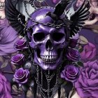 A striking figure adorned with elaborate purple makeup and a crown of roses and feathers. Surrounded by skulls, her dramatic look evokes a blend of gothic and fantasy elements.