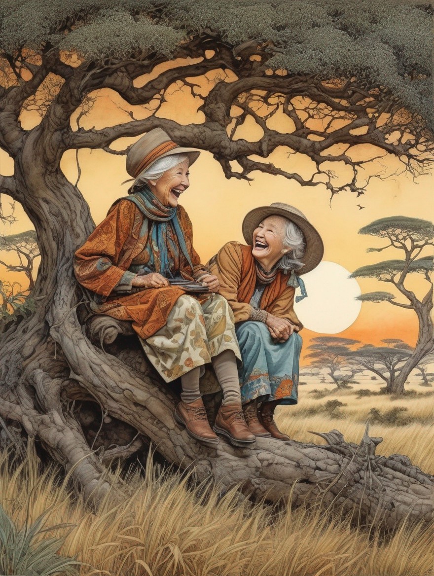 Two elderly women share a joyful moment under a tree at sunset, with a serene landscape and baskets of fruit around them.