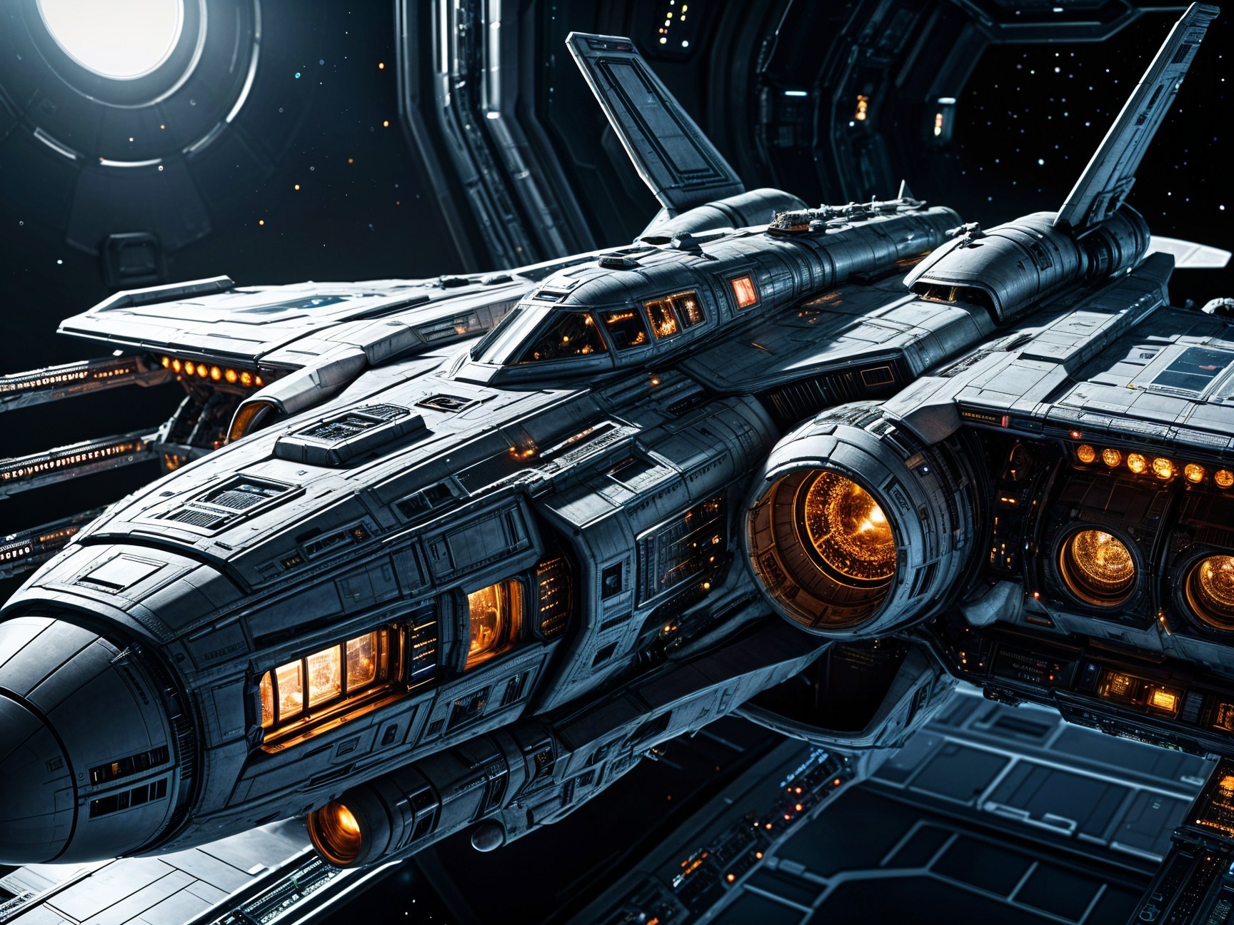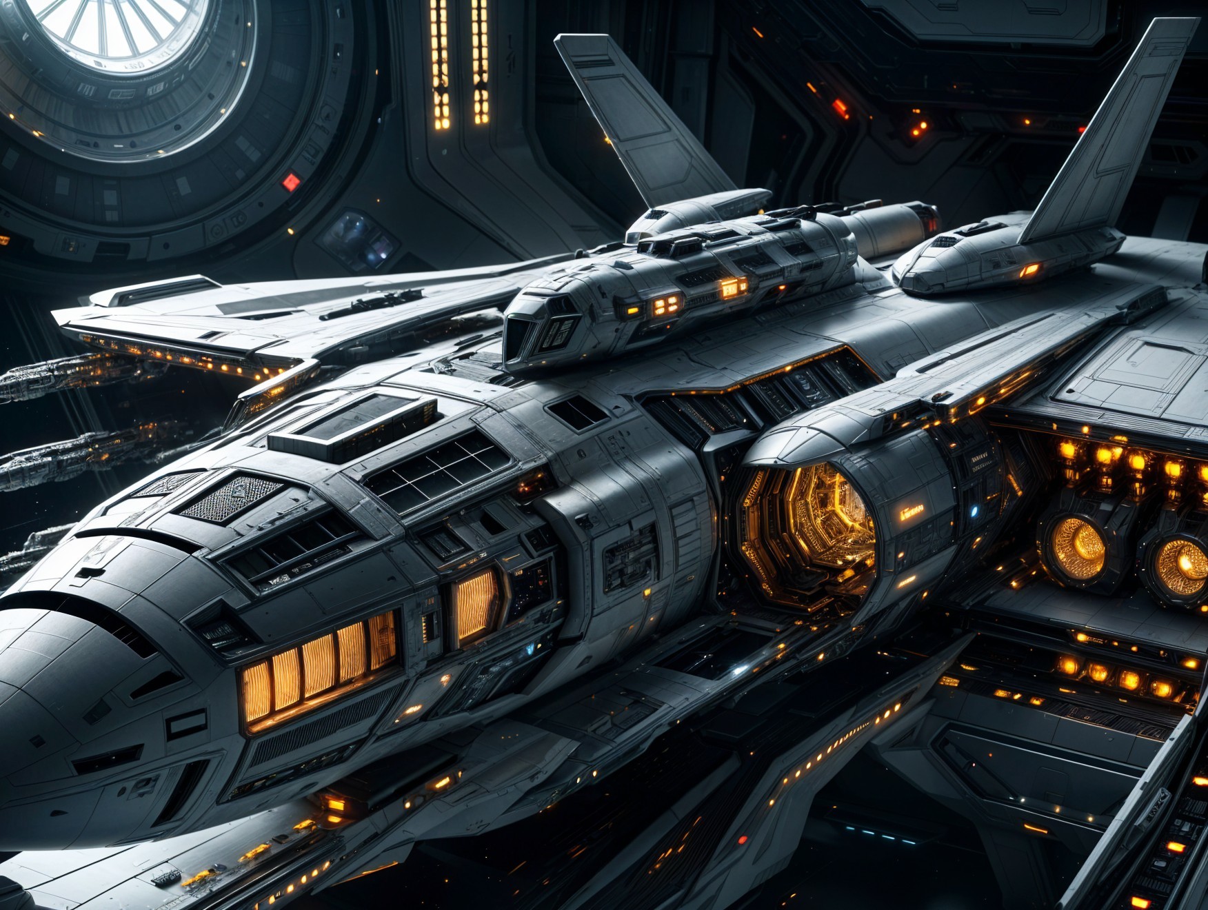 A futuristic spaceship with intricate details and glowing displays is docked in a sleek, high-tech environment. Its metallic surface reflects the ambient light, creating a sci-fi atmosphere.