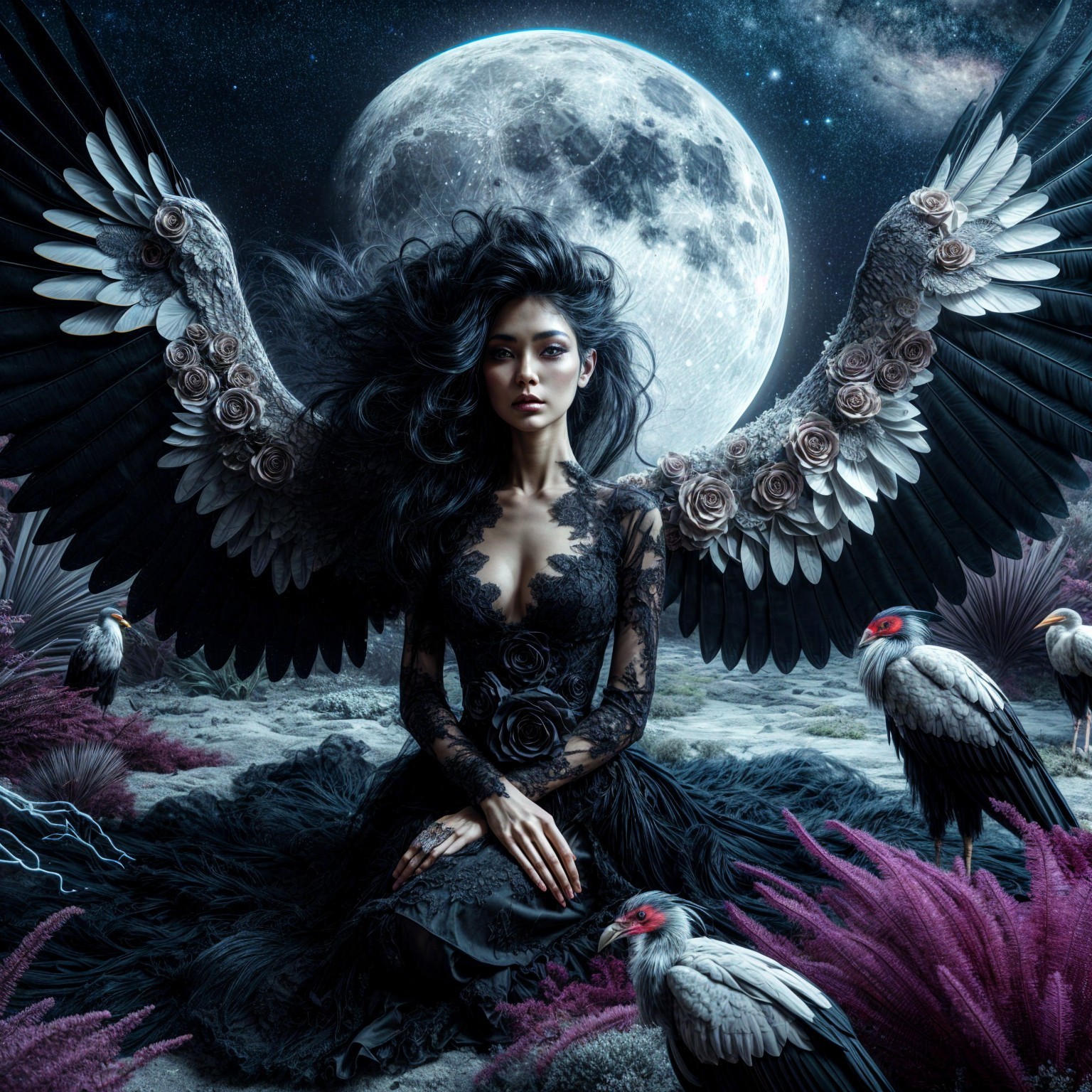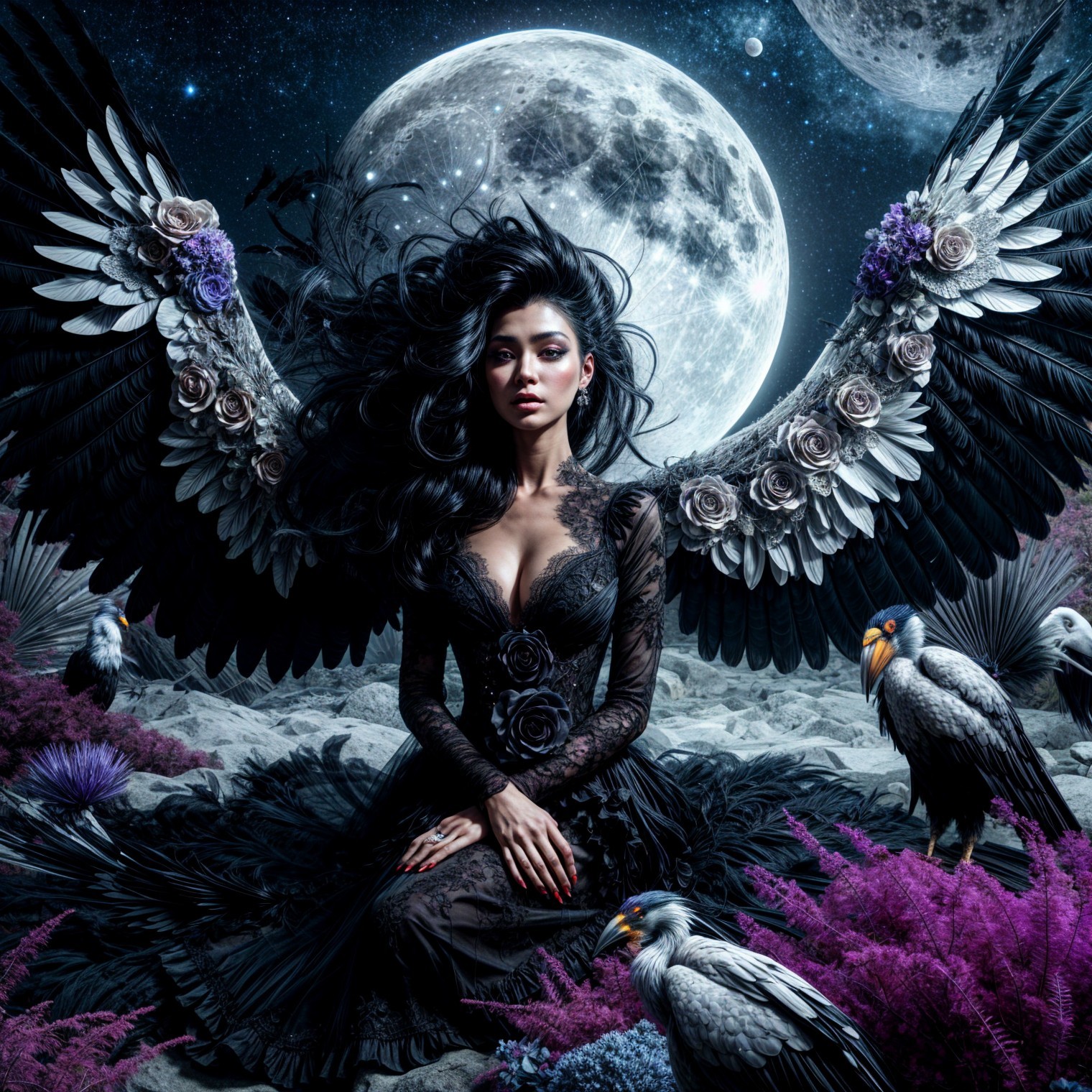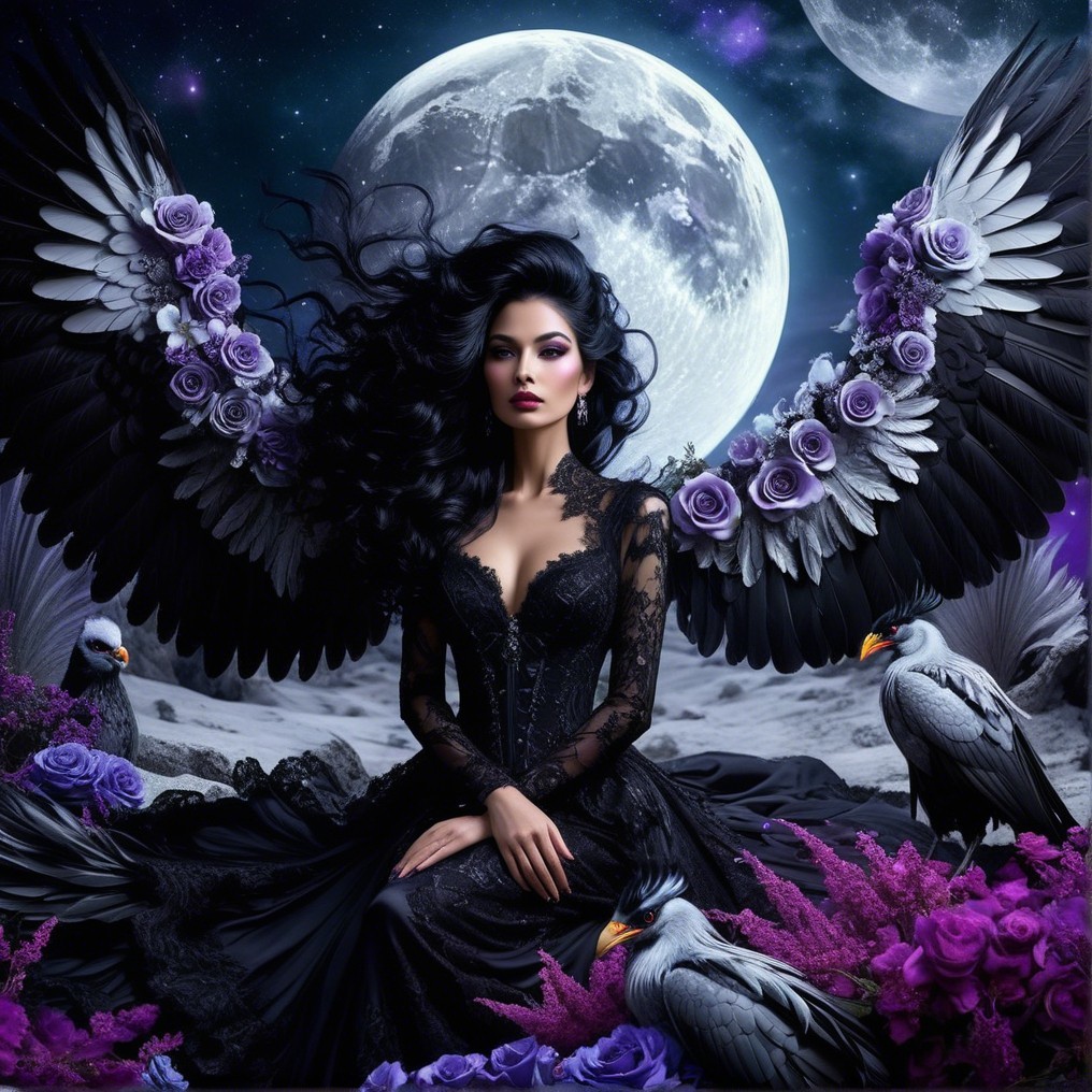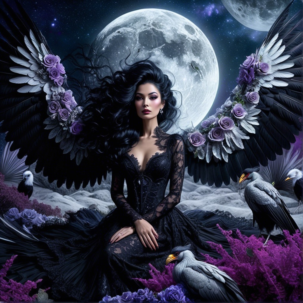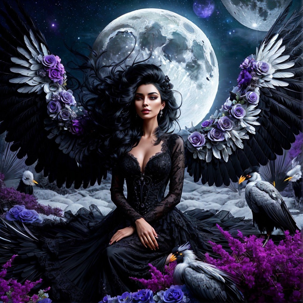 A mystical figure with dark, flowing hair and intricate wings adorned with purple roses sits amidst a dreamlike landscape, framed by two large moons and surrounded by vibrant flowers and birds.