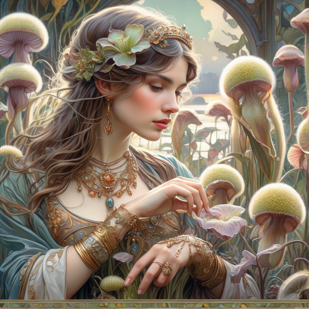 + Prompt:Art nouveau, a beautiful young woman walking in a wet marshland populated with carnivorous plants. style Alphonse Mucha and William Waterhouse and van Gogh, at sunset. Hyper-detailed, hyper-realistic, photo-realistic, ornate, meticulously detailed, vibrant colors, meticulous, intricate and highly detailed illustration, watercolour by jean-baptiste monge, by Arthur Rackham, by Paul Klee, hyper-realistic, ornate, meticulously detailed, intricate, highly detailed, illuminated, cinematic lighting. Extremely detailed. Masterpiece.