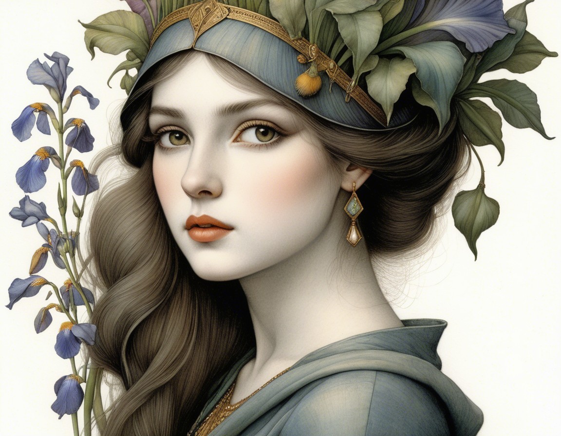 A portrait of a young woman with a colorful headscarf and flowers, showcasing soft, wavy hair and delicate features.