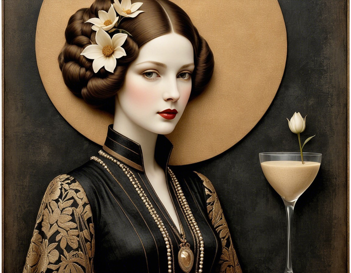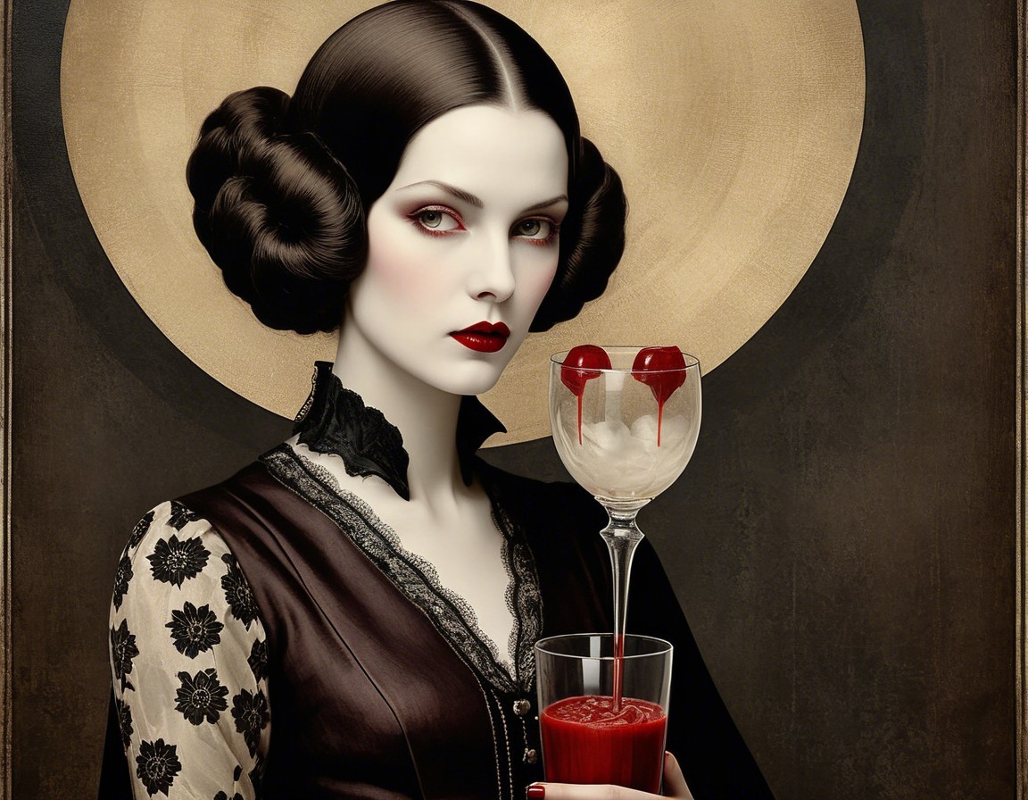 A glamorous woman with an elegant updo and striking red lips holds a glass of dark red drink. She's dressed in a rich, red gown and draped in black, against a softly illuminated background.