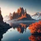 The image showcases a stunning mountain landscape at sunrise, with towering peaks reflected in a tranquil lake. Autumn foliage adds a splash of orange, creating a serene and picturesque scene.